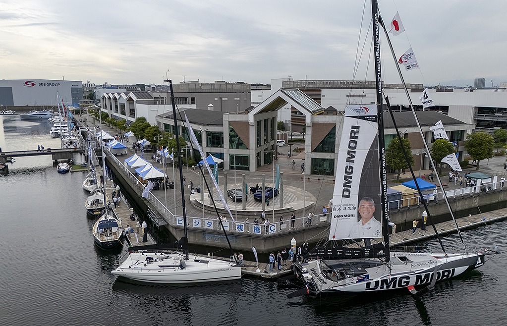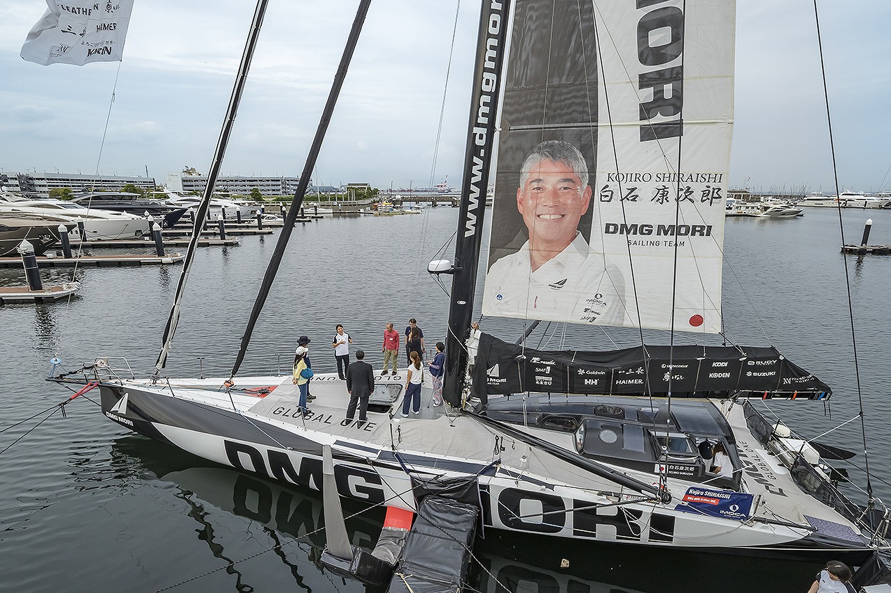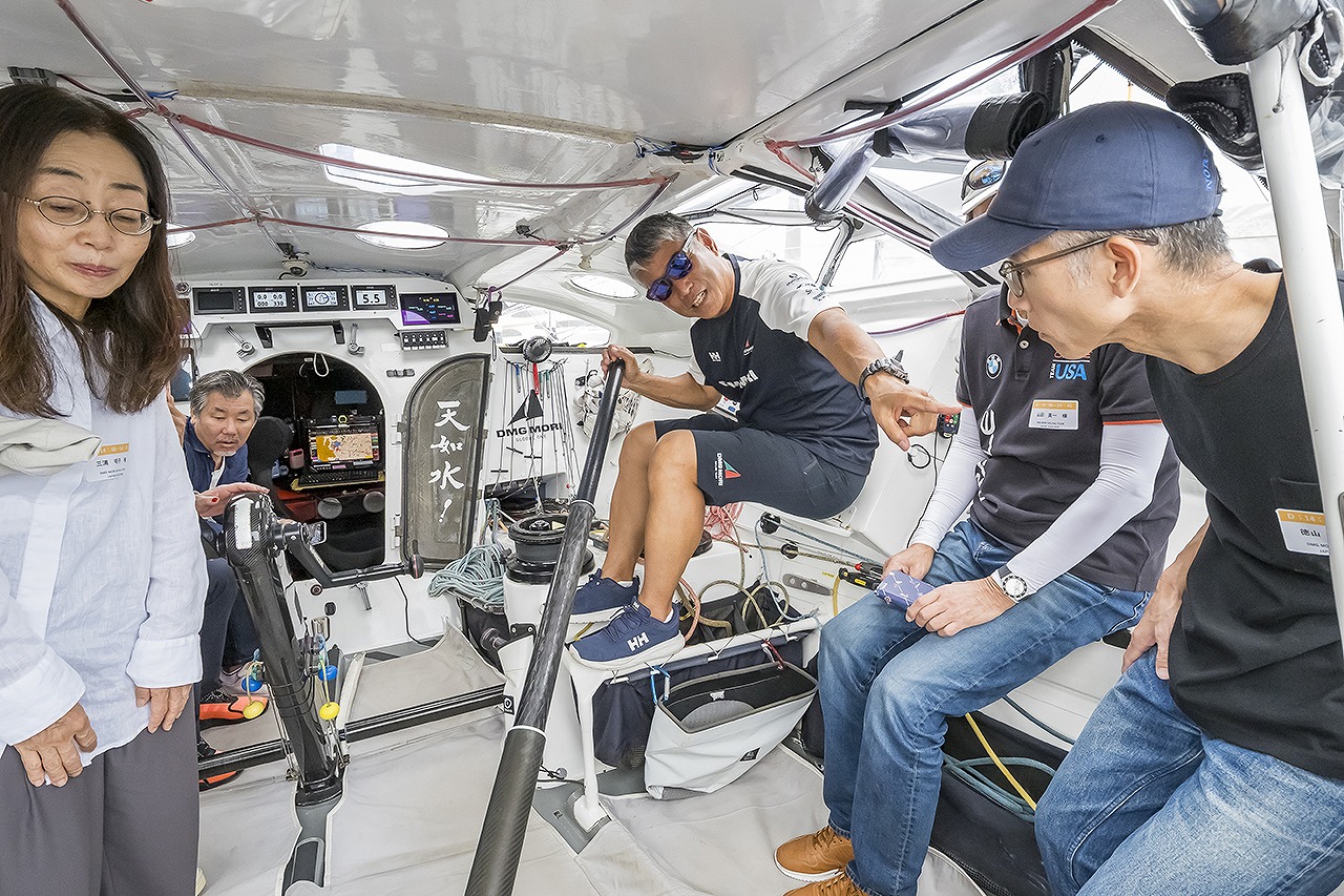 ヴァンデ・グローブ2024-2025に出場し、完走を果たしたIMOCA60〈DMG MORI Global One〉を特別展示。白石康次郎さんも来場し、応募抽選の当選者による船内見学会が開催された