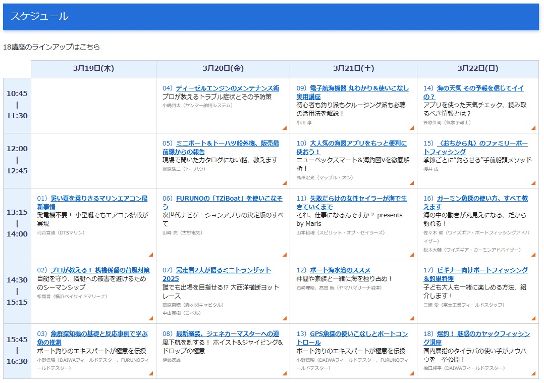 今年の「海ゼミ」は全18講座。このたびボートショー公式サイトの中に、各講座の詳しい情報が掲載されたページがオープンした。まずは自分の興味のある講座がないか、チェックしてみよう。受講は無料なので、この機会をお見逃しなく(ボートショー会場への入場には入場券や招待券が必要)。