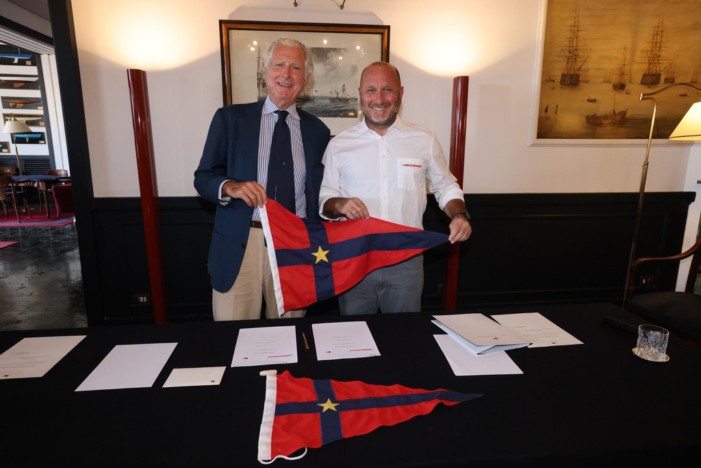 AC挑戦チーム、ルナロッサのCEOマックス・シレナ(右)と、次回ACにルナロッサを送り出す挑戦ヨットクラブになるイタリアボート&セーリングクラブ(在ナポリ市)会長のアゴスティーノ・ランダッツォ(左)