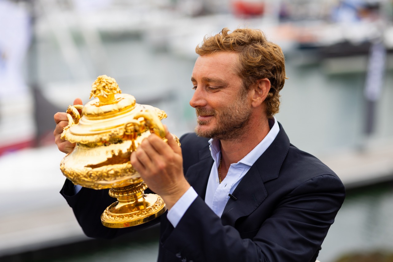 これが優勝杯のアドミラルズカップ。復活1回目はモナコヨットクラブのキャプテン、ピエール・カシラギ(モナコ公国の公女の子息)の手に。日本から再びこのカップ獲得を目指す外洋レースチームが出てくることを願う