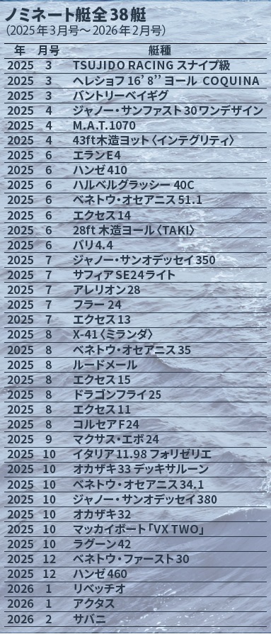 2025年3月号から2026年2月号までに紹介した、艇紹介および、艇の性能を取材し分析した記事を加えた38艇が対象。左記5人の識者に加え、植村浩志(舵社社長)と、安藤 健(同営業部)にKazi編集部員を加えた11人で選考。それぞれ1~10位を決め、1位30点、2位29点……10位11点を加点、識者の5人以外は1位20点からスタートした。