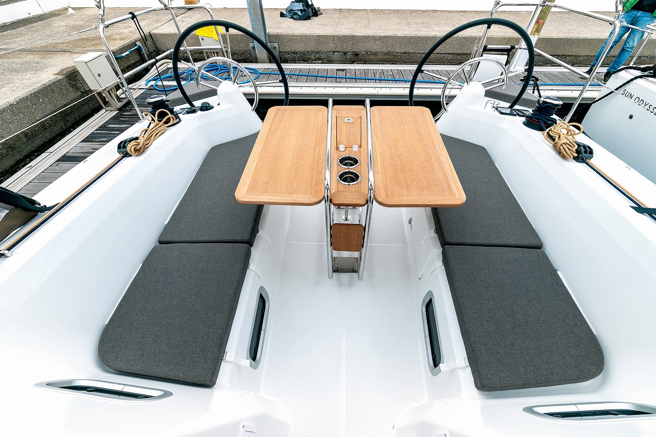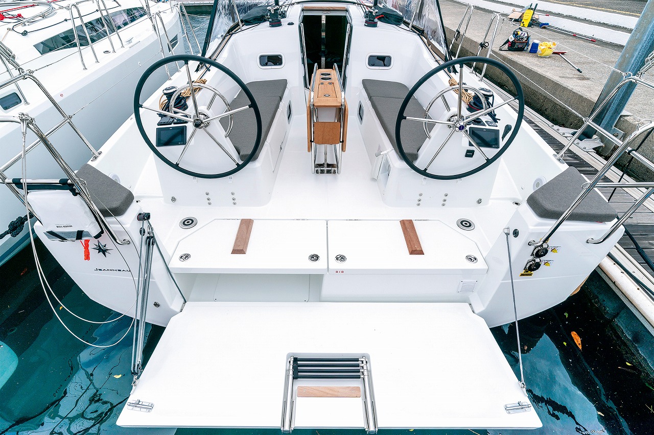 船体長さ9.99mのミドルサイズでありながら高い居住性と帆走性能、そして美しいスタイリングの三位一体を、見事に実現させたジャノー快心のクルージングモデルだという印象を持っている。ひとクラス上の快適な居住環境が充実した、ゆとりの船内空間とデッキレイアウトを持ち、さらに実際の試乗では、そのボリュームたっぷりの船体を爽快なスピードで走らせることができるセーリング能力にも、心底驚かされることになった。セーリング中の姿が美しいのはもちろんだが、係留しているときや錨泊中の浮き姿にも思わず目を引きつけられるスタイリングも、おそらく高く評価されたのではないかと思う。