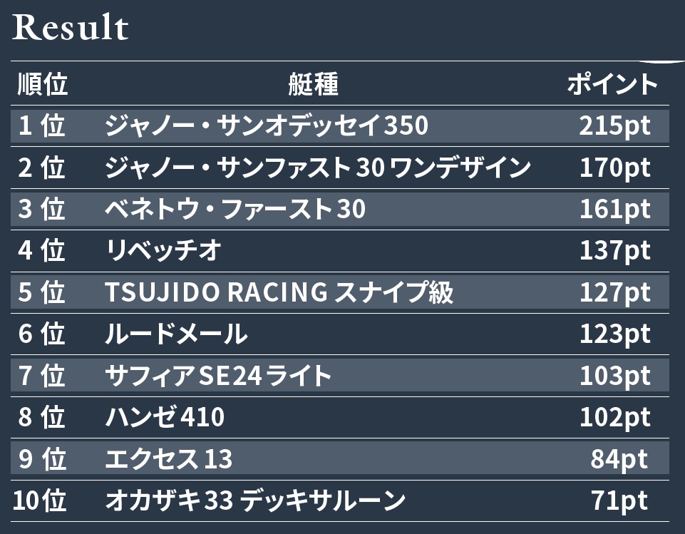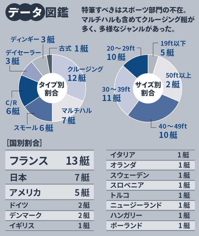 もう一つうれしいニュースは純国産艇の台頭。これまでの岡崎造船に加え、ニュージャパンヨットのリベッチオとルードメールの2艇がベスト10入り(リベッチオは部門賞受賞)。輸入部材の高騰で国産だから安いというわけにはいかないが、手放しで応援すべき結果であった。これからも注視したい。