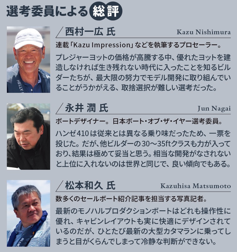 各選考委員の皆さんが言うように、対象期間における本誌のセールボート紹介が極端に少ない年度となった。38艇のエントリーを精査して思ったこと……、それは今年度はピュアレーサーと呼ぶべきスポーツボートがほぼなく、選考ジャンルとして成立しなかったこと。昨年度受賞艇フィガロ・ベネトウ3はピュアレーサーどころかフォイリングボートであったことを思うと、この時代の変容ぶりに戸惑いを隠せない。