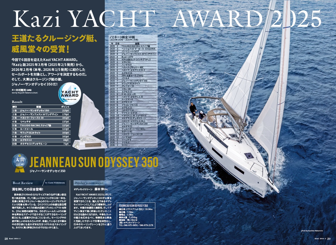 今回で6回目を迎えたKazi YACHT AWARD。『Kazi』誌2025年3月号(2025年2/5発売)から、2026年2月号(本号、2026年1/5発売)に紹介したセールボートを対象とし、アワードを決定するものだ。