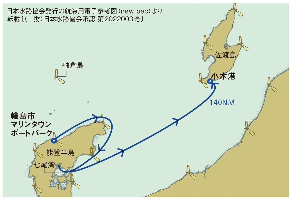 能登半島の天辺から七尾湾を経由して佐渡島へ。七尾湾は筆者・横山修二さんが愛艇を係留しているので、立ち寄ったのだ
