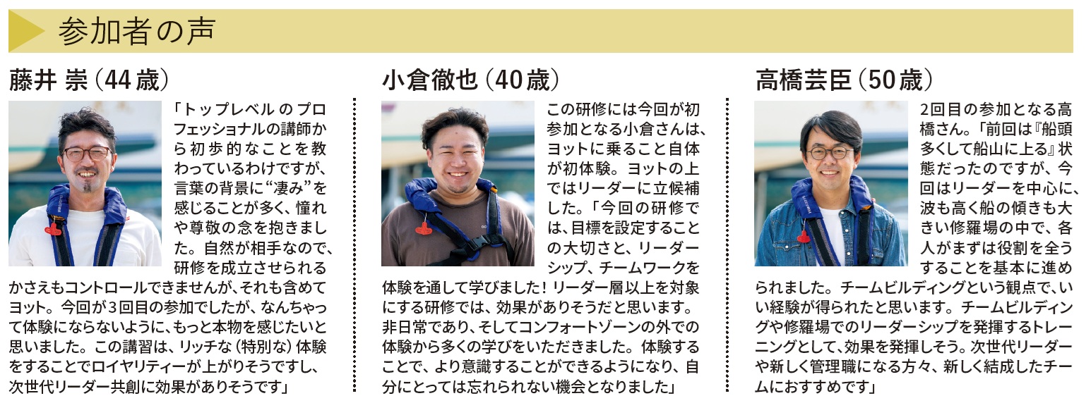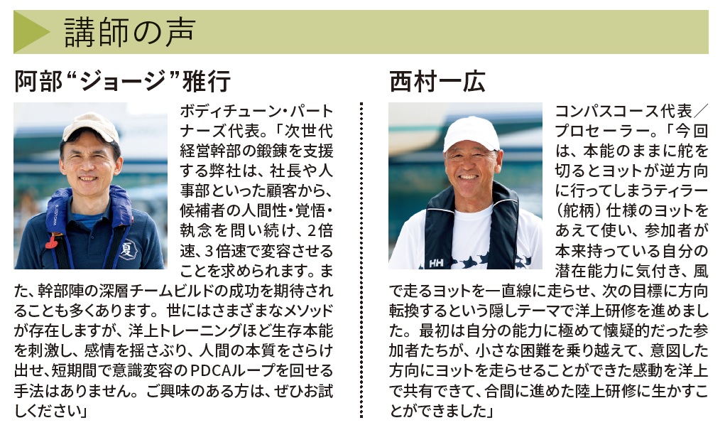 会議室とは違って、海の上は身の危険をリアルに感じる場でもある。おのずと緊張し、神経が研ぎ澄まされた状態だからこそ、得るものは大きい。余暇を楽しむのとはまた違った大きな学びがあり、研修のプロたちにとっても刺激がある一日になったようだ。
