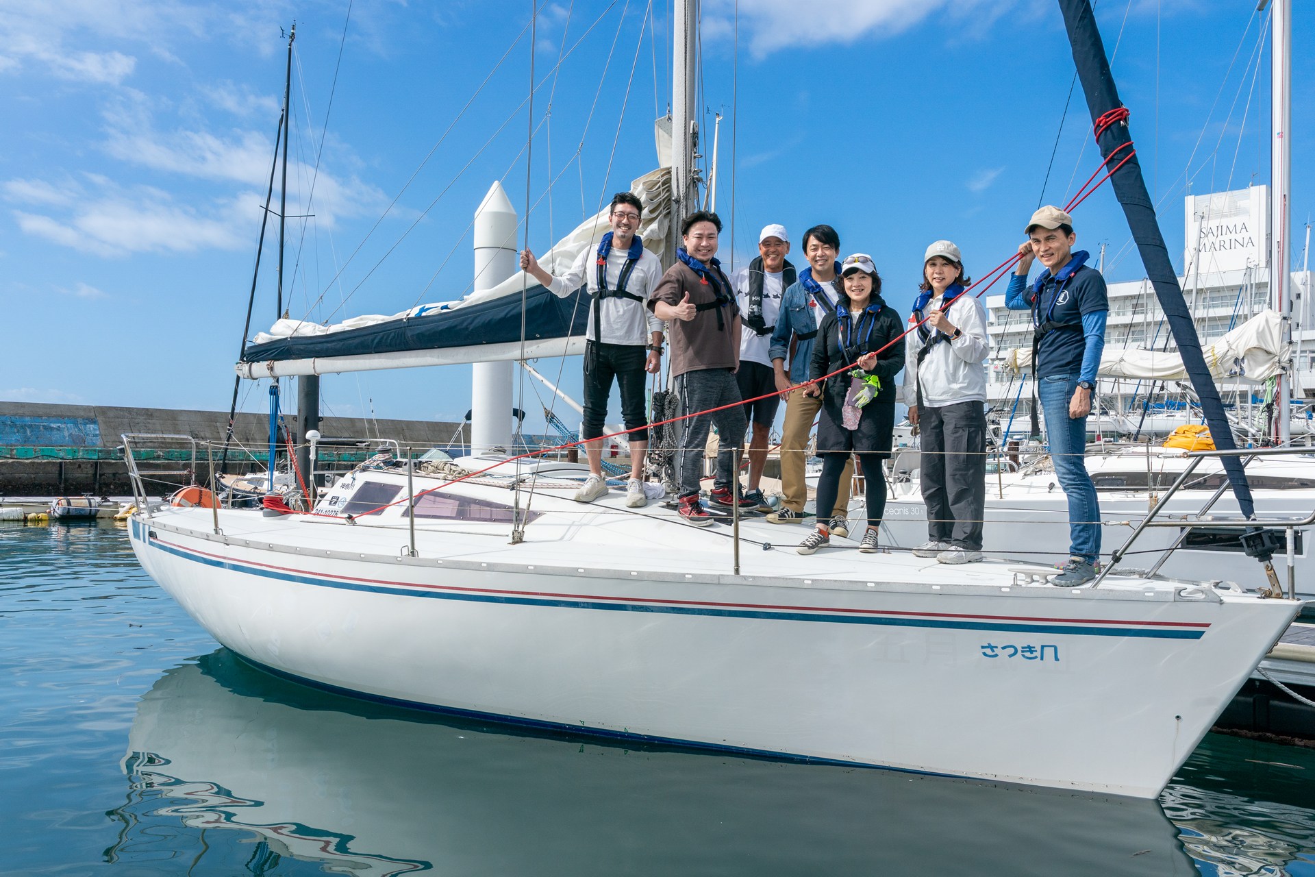 出航前に佐島マリーナに浮かぶ教習艇の上で、講師、受講者、スタッフがそろって記念撮影。今回の講習では全長30フィート(約9メートル)のセーリングクルーザーを使用した。海辺での講習ということ自体が、受講者の多くにとっては「非日常」となる