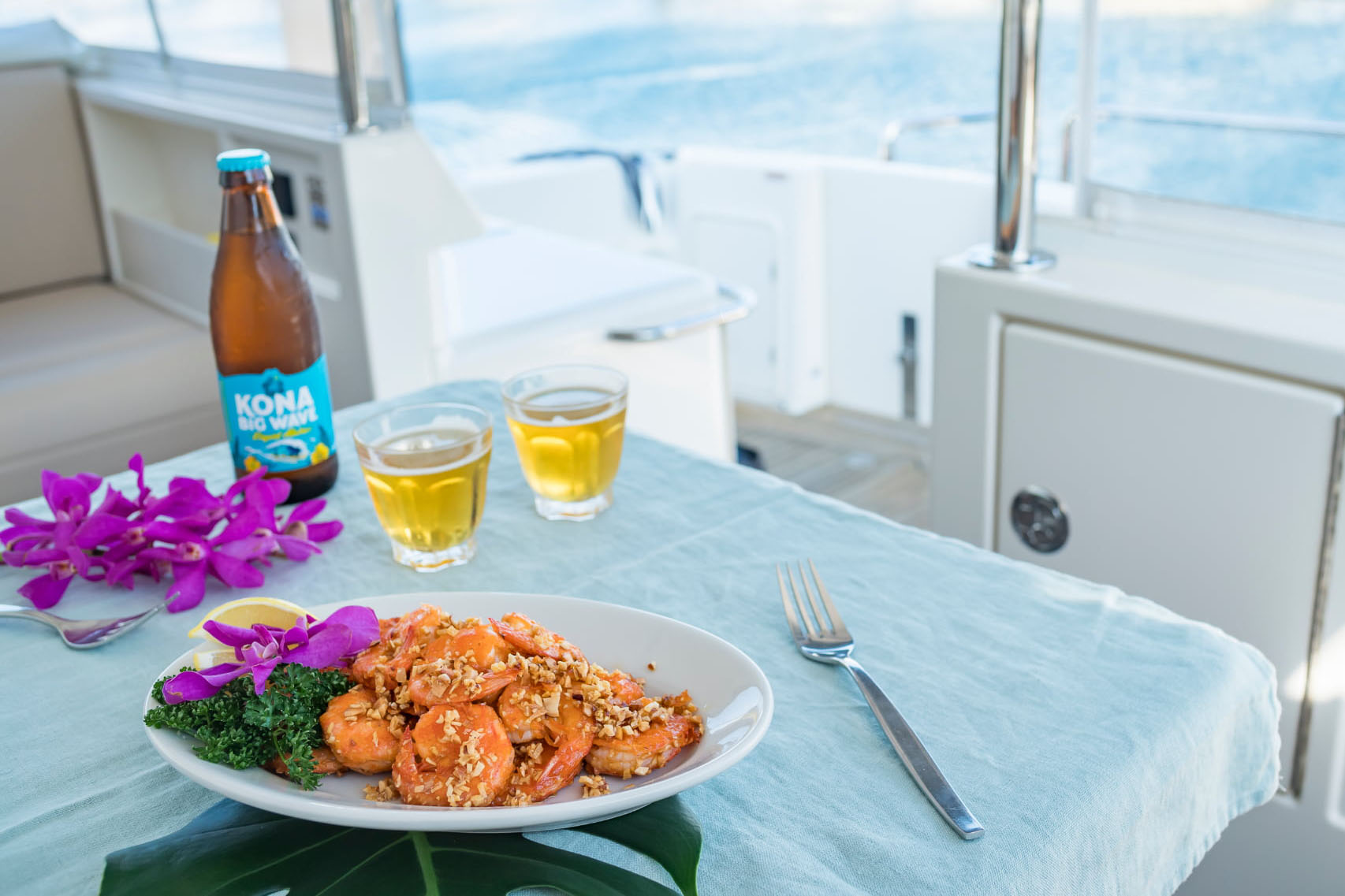 香ばしいニンニクの香りがキャビンいっぱいに広がれば、海の上でも食欲は最高潮。プリッと弾けるエビに、オイルとガーリックの旨味が絡む一皿。フライパンひとつで完成する海のごちそうを、ぜひご堪能あれ。