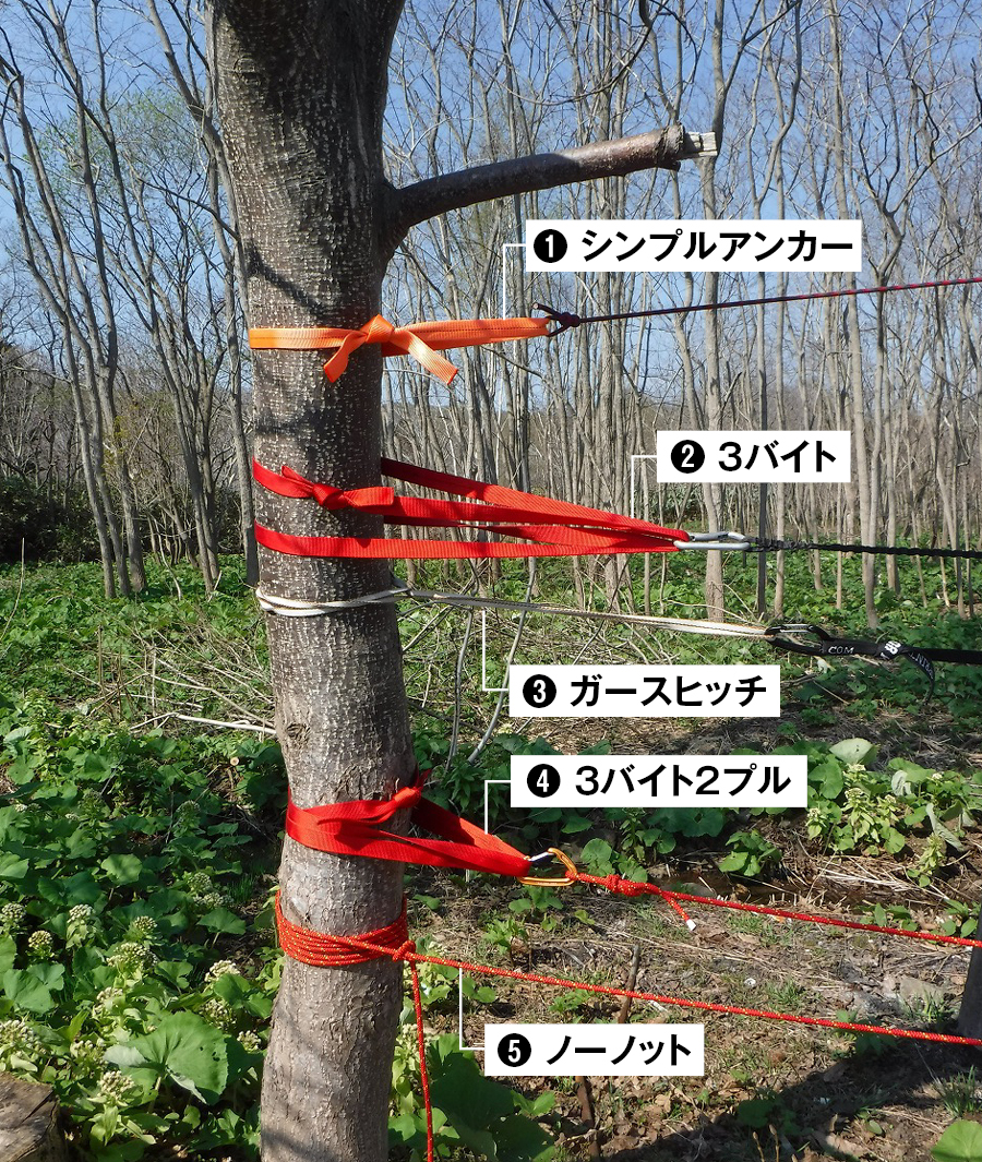 ウェービングテープやダイニーマ スリングがない場合に、メインロープで直接アンカーを取る方法。ロープの摩耗が起きやすい。強いテンションが掛かった場合でも解除しやすい。