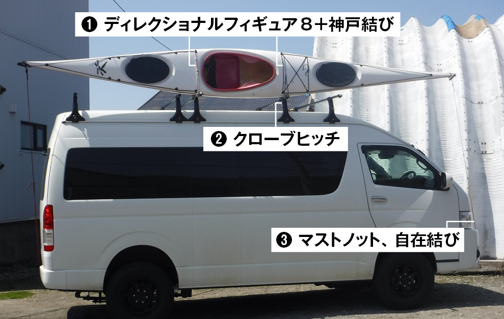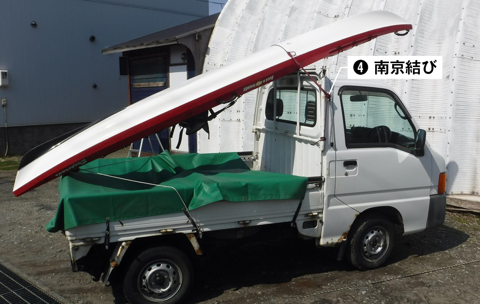 トラックにカートップする場合に適している。6~12ミリの細引きまたは綿、麻ロープを使用。トラックのようなフック金具が付いているクルマの荷台に固定するのに向いた結索法。