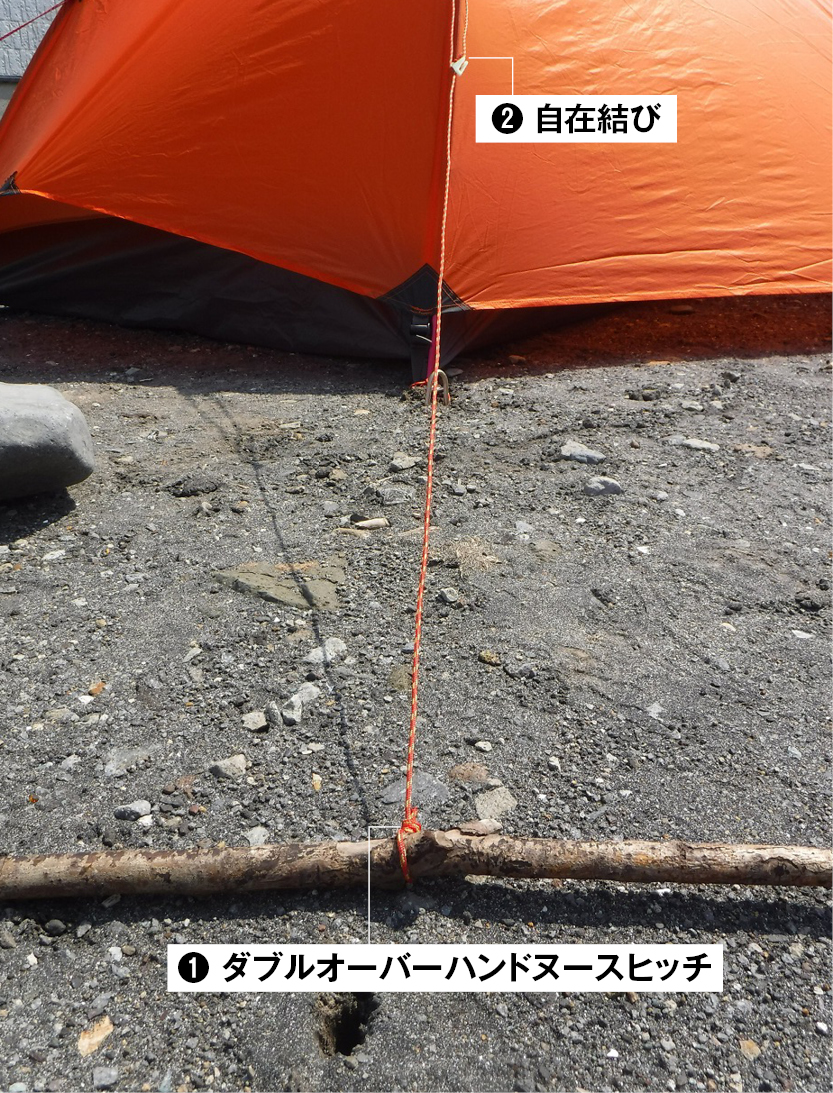 テント設営には2~4ミリの細引きを使用。一般的にメーカーはペグ側の結索を自在結びにしているケースが多いが、それが適しているのは整地されたキャンプ場。砂浜や岩場など固定用にペグが使用できないフィールドでは、固定する側の結束にはダブルオーバーハンドヌースヒッチを用いる。