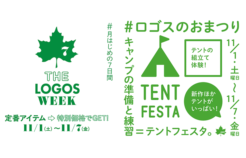 そのロゴスが、11月1日(土)から11月7日(金)まで、「THE LOGOS WEEK」と、「テントフェスタ」を同時開催しますよ!