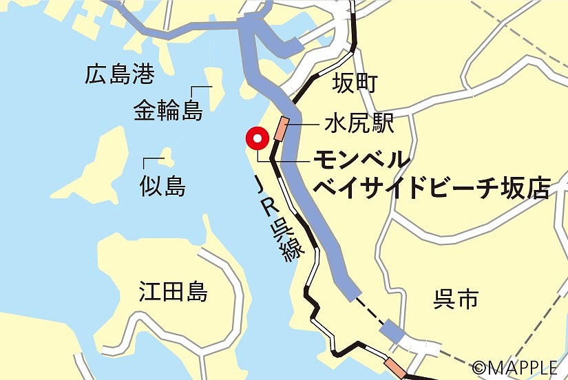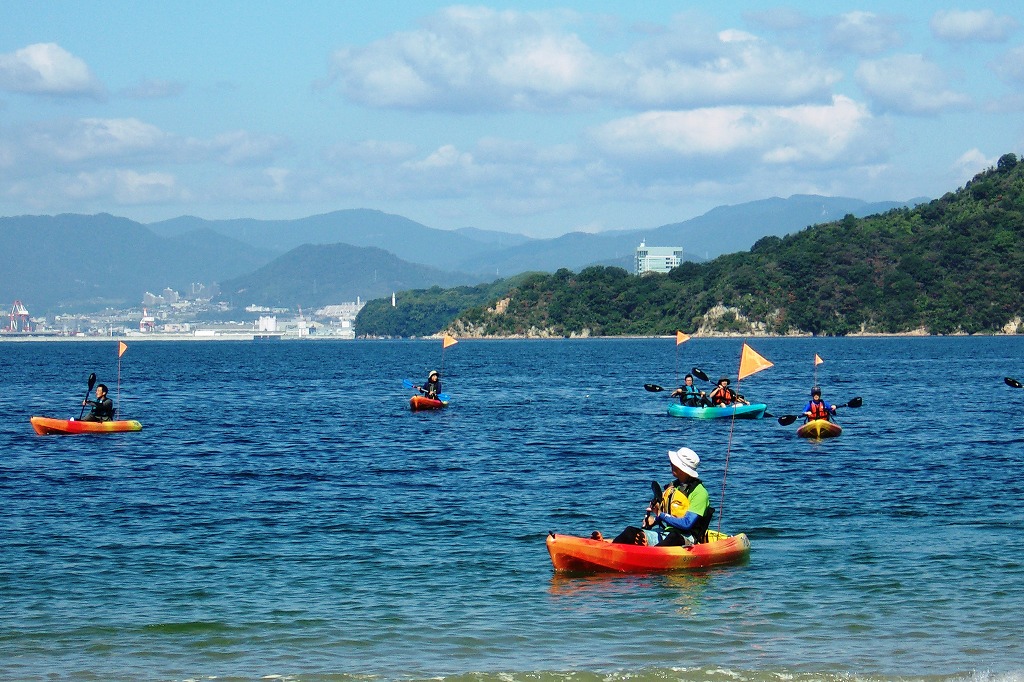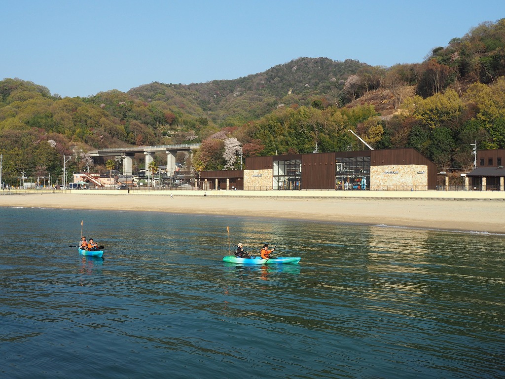 広島市と呉市を結ぶ国道31号線沿いの「ベイサイドビーチ坂」にあるモンベルストアです。目の前の浜で開催されるM.O.C.のカヤック体験は、安定性のよいシットオントップを使用し、2人艇もあるので子ども連れの参加も大歓迎。また今年から始まったフォールディングカヤックの体験会では、組み立てから実際に漕いで撤収まで、説明書に書いていないようなこともわかりやすく教えてくれます。防波堤で仕切られた湾内はパドリング練習に最適、カヤックフィッシングを楽しむ人も数多くいます。