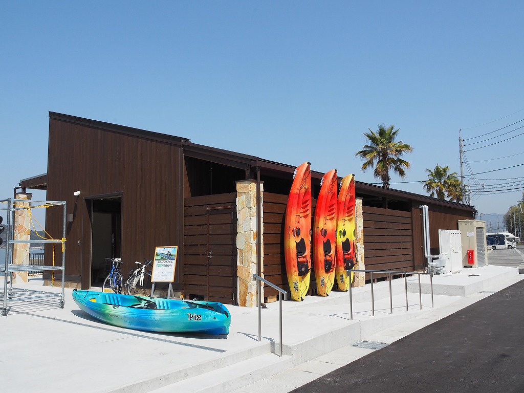JR水尻駅の目の前で電車でも来店しやすいロケーション。カヤック体験は店舗の目の前の浜で開催されます