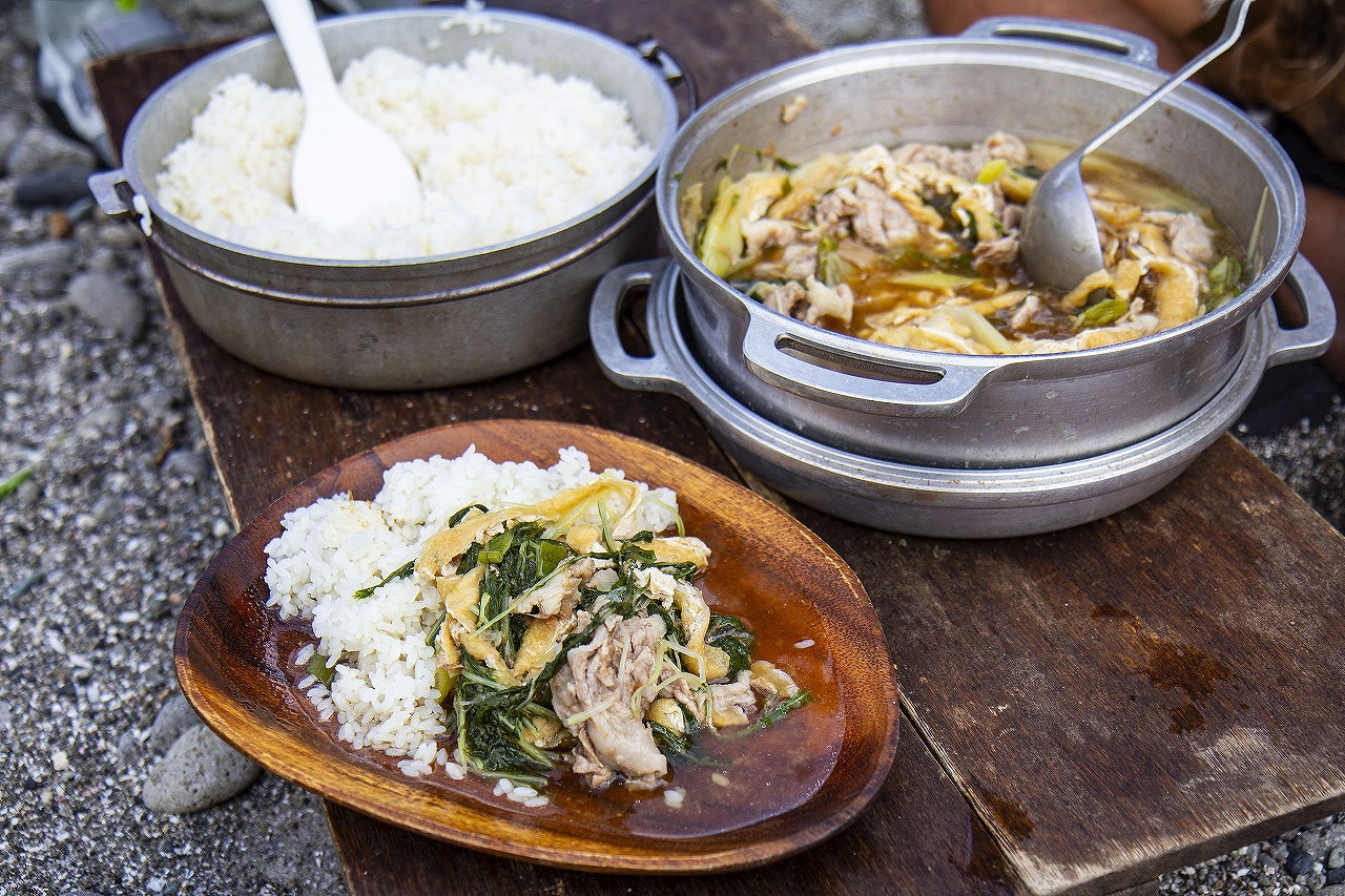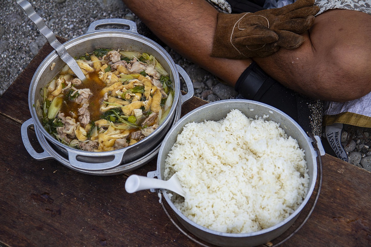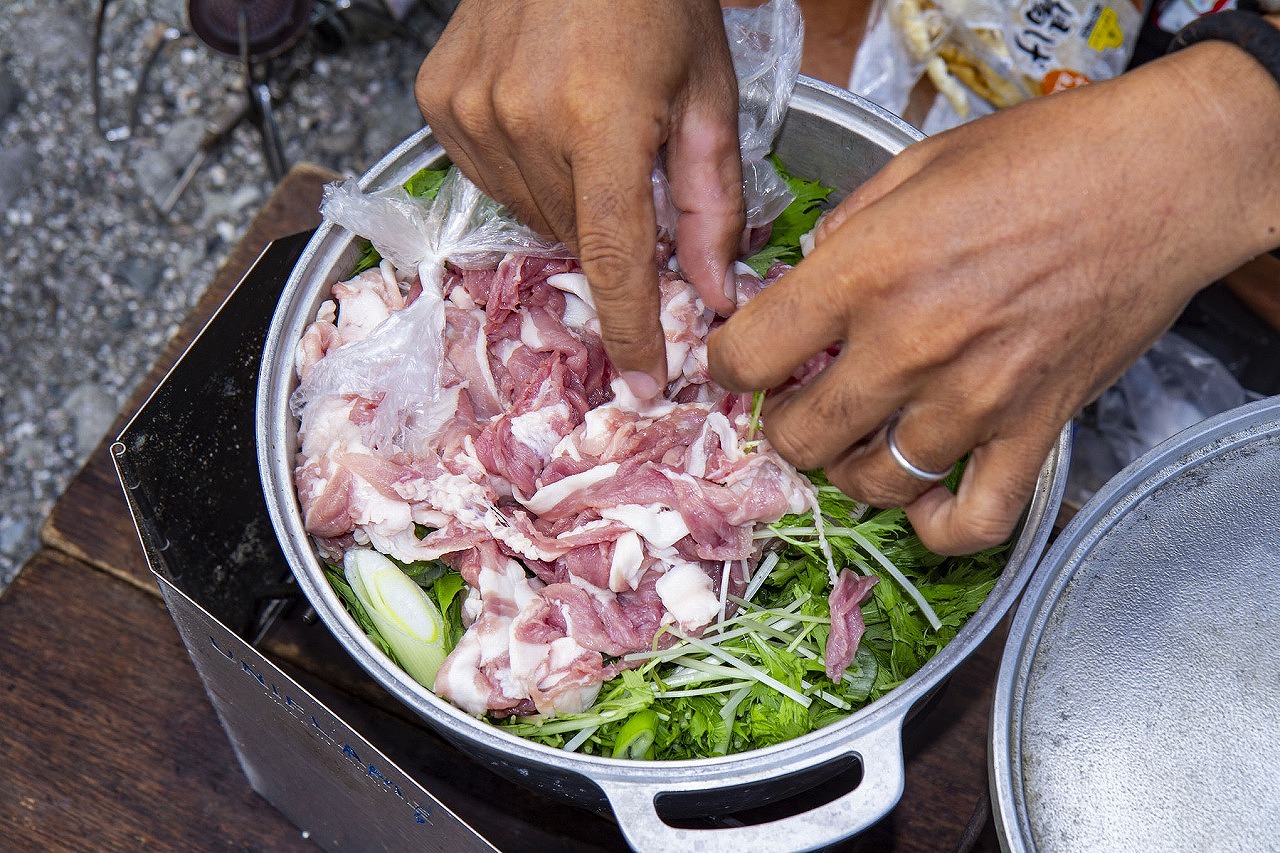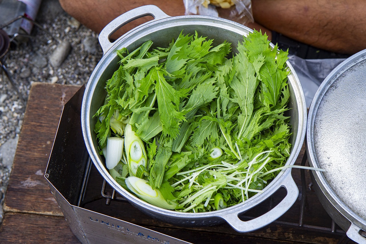 ここでご紹介するのは、そのとき洞窟探検を目いっぱい堪能したあとで食べたランチ、「豚バラのハリハリ鍋」。ハリハリ鍋は、大阪や京都を中心に関西で広く食べられている料理で、水菜を食むときのハリハリという食感が名前の由来だそう。本来は鯨肉を使うのですが、今回は手に入りやすい豚バラを使っています。