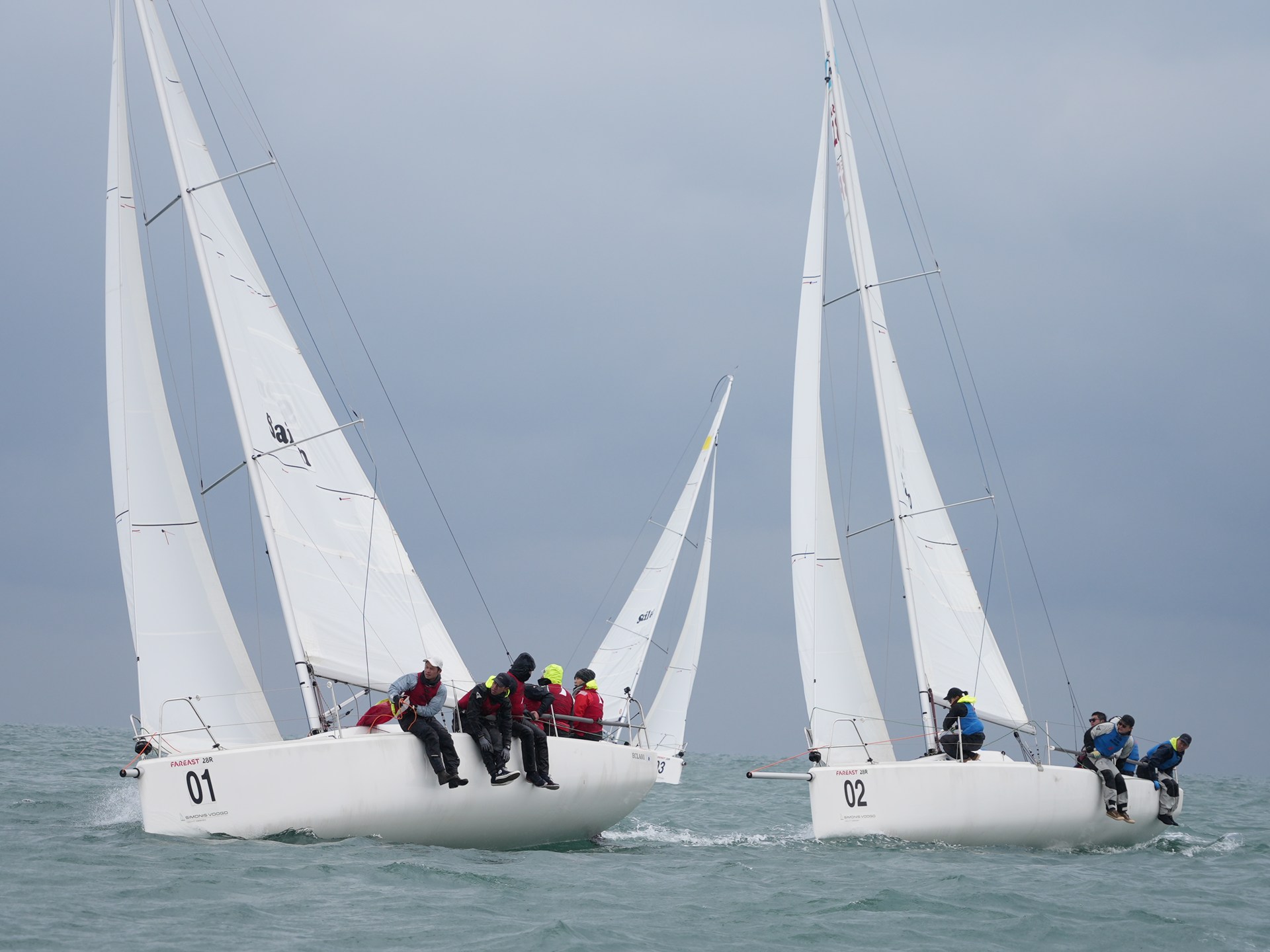 走り合わせをした後は、さっそく実際にレース形式でのバトルがスタート。風速は12~14kt程度、冷たい雨が降りしきる極寒のコンディションだ。