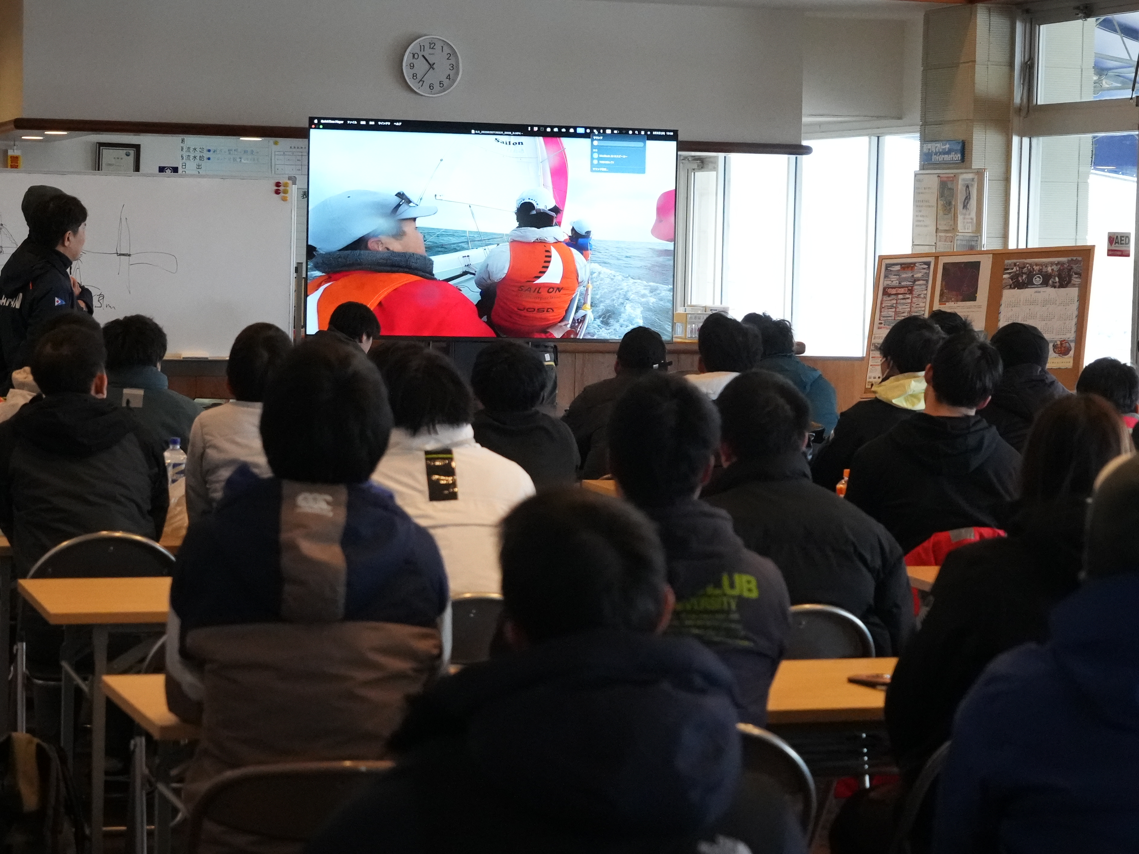 ハーバーに戻ると、撮影したての動画を見ながらのレクチャー。セーリングが終わって時間を置くこともないから、舩澤さんと後藤さんの言葉に、選手全員が食い入るように耳を傾けている。