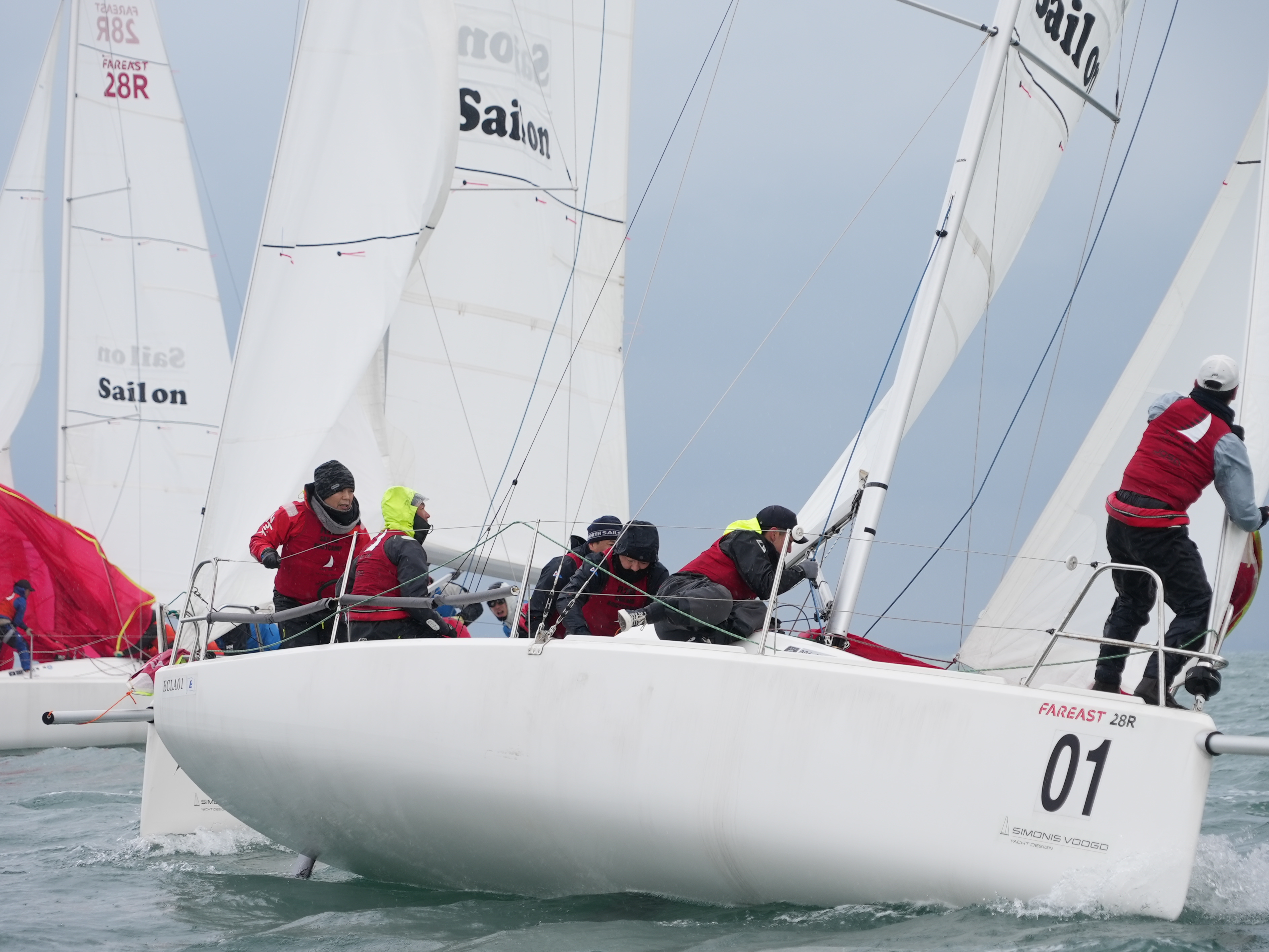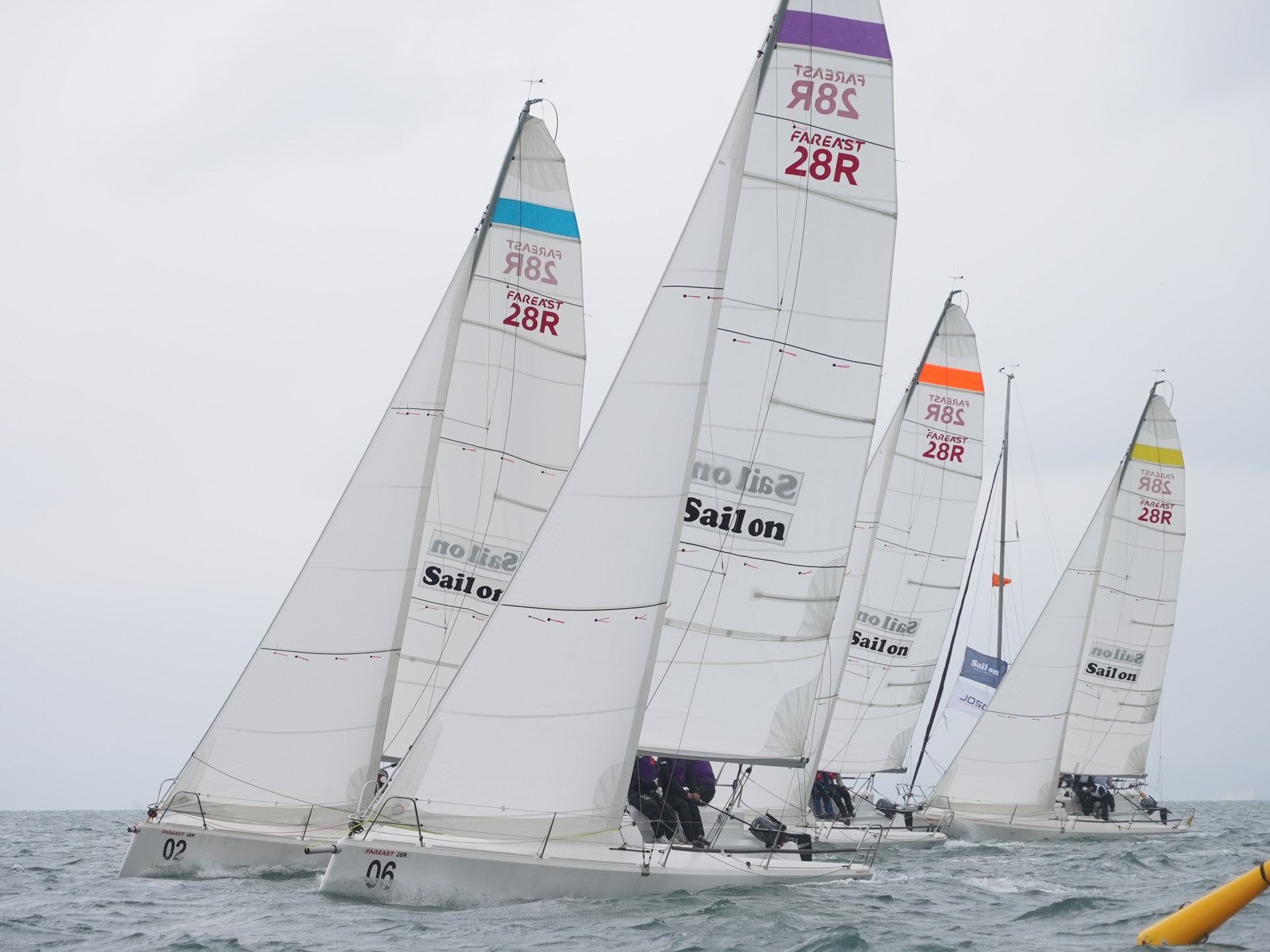 走り合わせをした後は、さっそく実際にレース形式でのバトルがスタート。風速は12~14kt程度、冷たい雨が降りしきる極寒のコンディションだ。