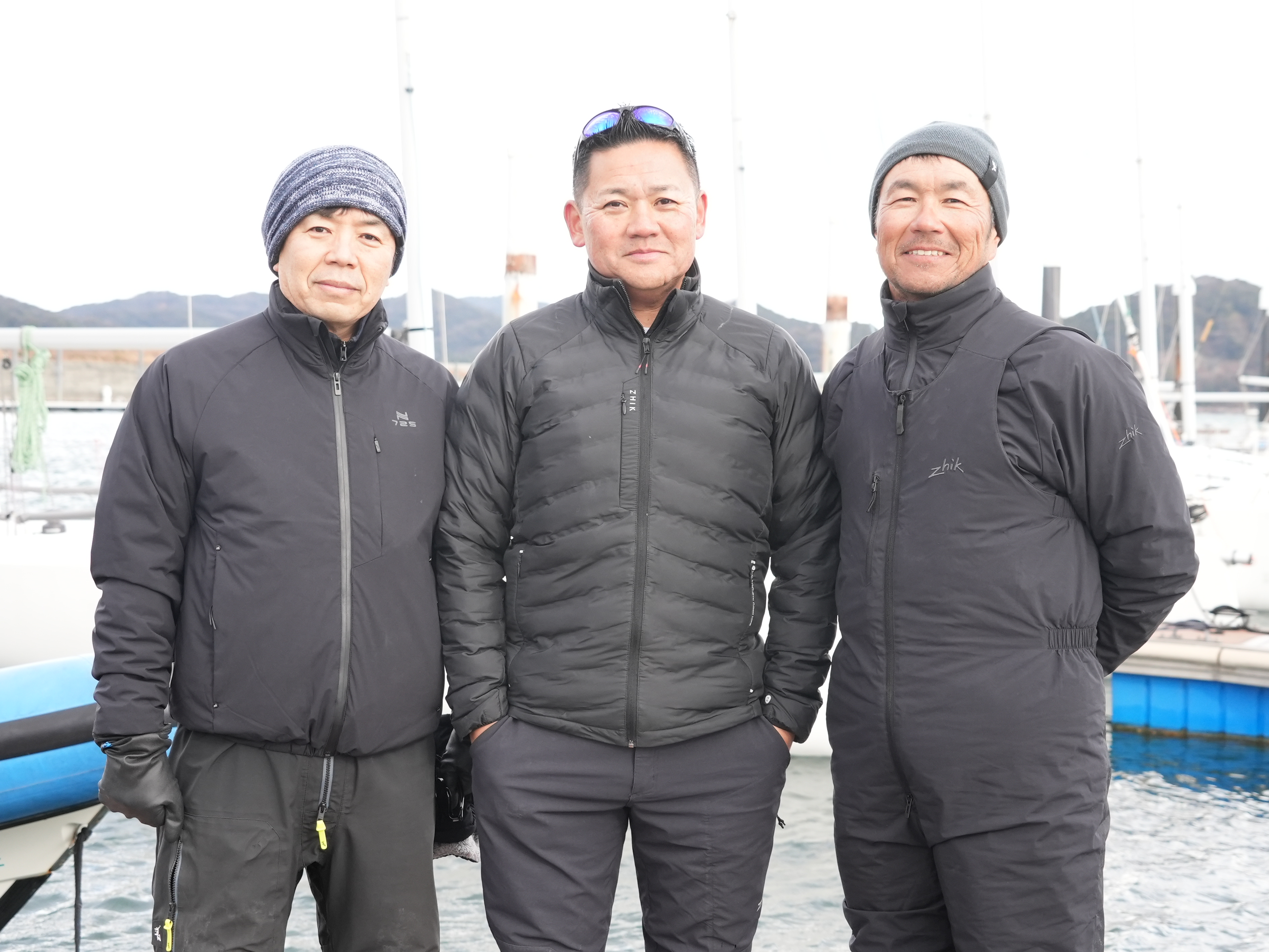 次世代に夢をつなぐ仕掛け人、藤田武己さん(ECLエージェンシー|写真中央)。自身も外洋レースを中心にセーリング活動を続けており、本イベントの企画立ち上げから運営まで獅子奮迅の動きで大活躍した。左は船澤泰隆さん、右は後藤浩紀さん。50代の3人のセーラーが、次世代につなぐ取り組みに挑戦している。