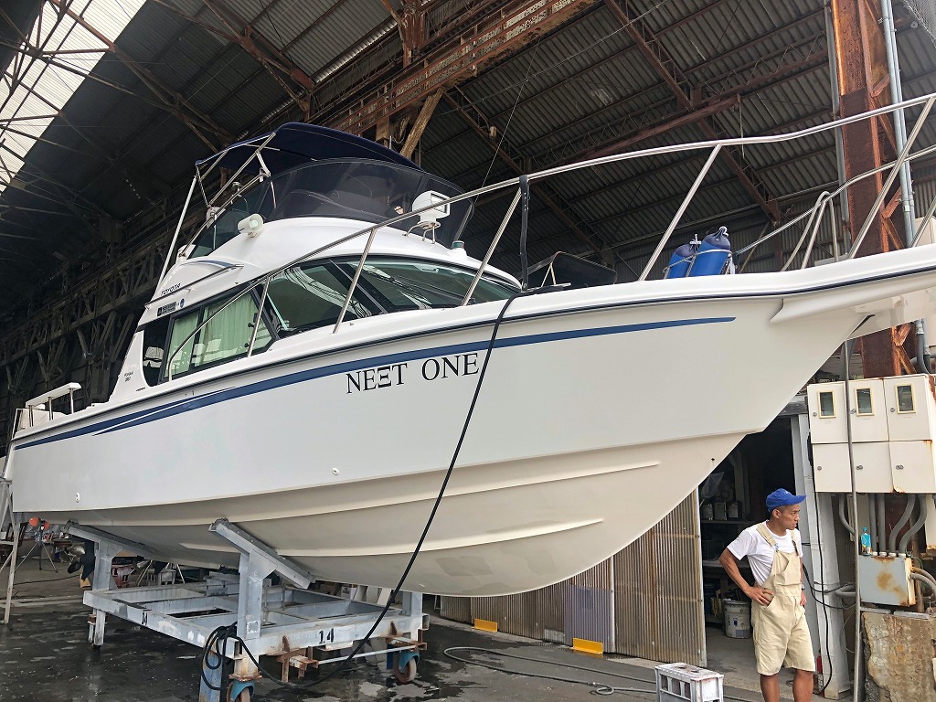 念願のマイボート〈NEXT ONE〉(トヨタ・ポーナム28GⅡ)。これは納艇前、最後の整備点検のためドック入りしたところの写真です。なんともりりしい姿に思わず見ほれてしまいました(笑)