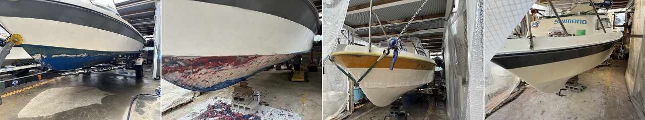 船体も塗りなおし(左→右で時系列。一番右が完成形)。剥離剤を塗って元の塗装(3回ほど塗り重ねあり)をはがすのは予想以上に大変でした。ハルはウレタン塗装で仕上 げ、船底はローラーでトップコートを塗りました