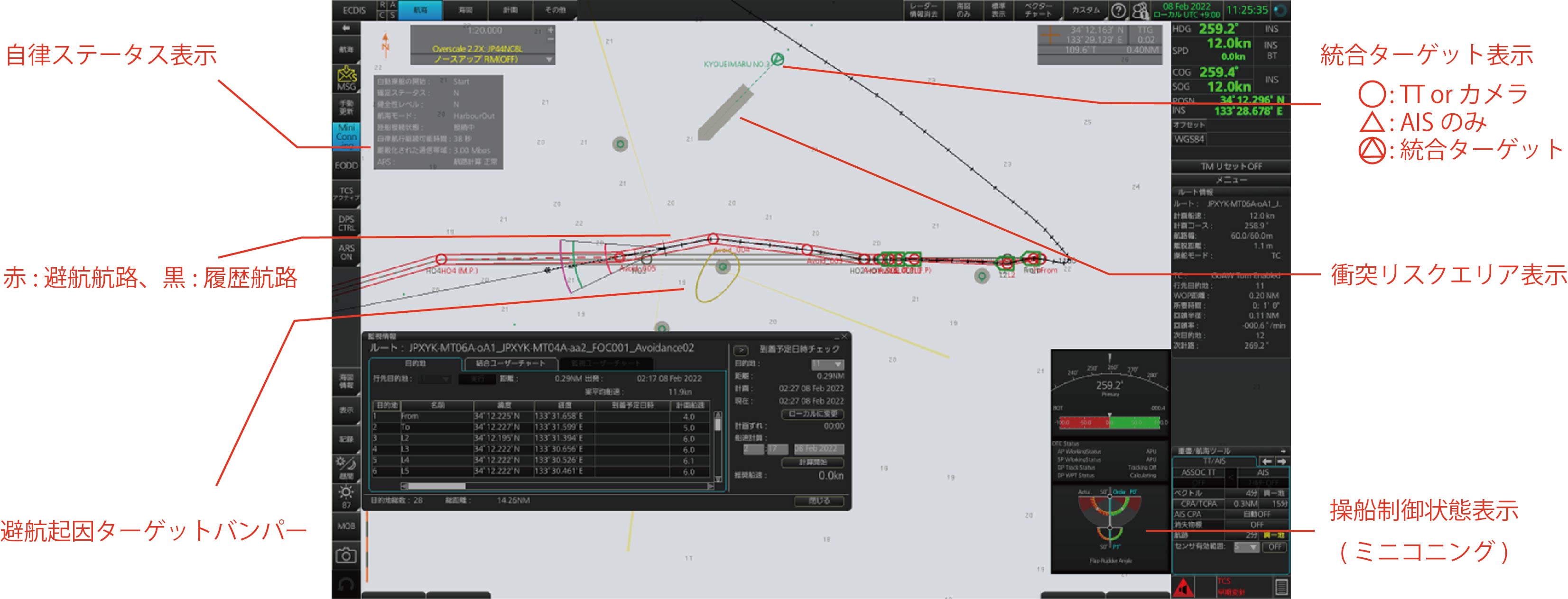 避航操船支援システムは、航海用レーダーをはじめ各種センサーからの情報を統合し、自船周囲のターゲット情報を正確に把握⇒情報をもとに衝突リスクを算出・表示⇒日本海洋科学の船舶自律化システム向け行動計画策定ソフトウェアと連携、最適な避航航路を自動立案&航路制御する。