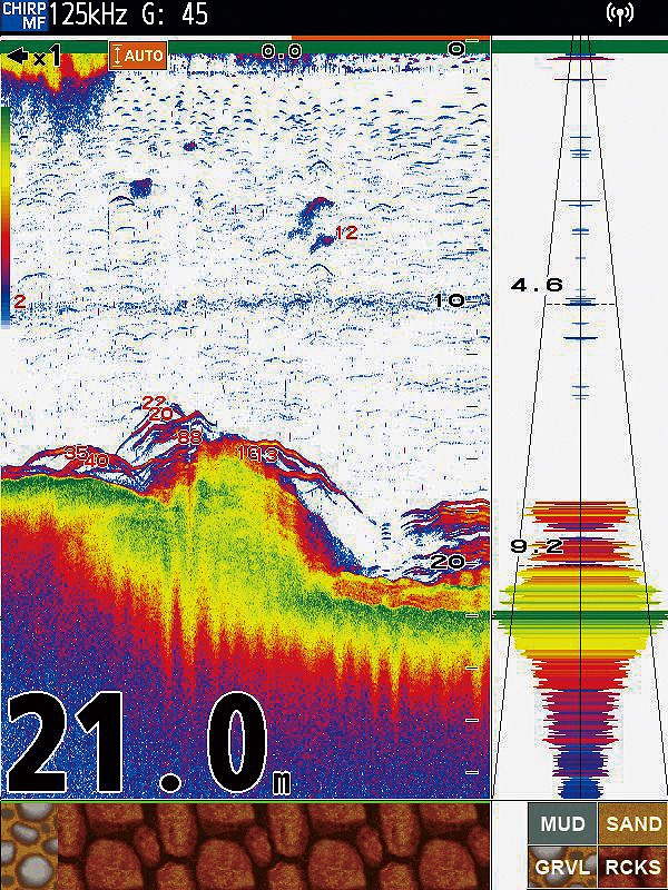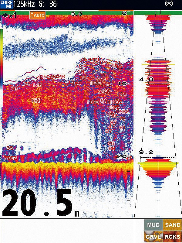 猿島付近は海底地形が変化に富み、高根周りにアジらしき魚群反応が高確率で見られる。2 ~3ノットの船速だと地形が把握しやすいだけでなく、即時停船も可能だ
