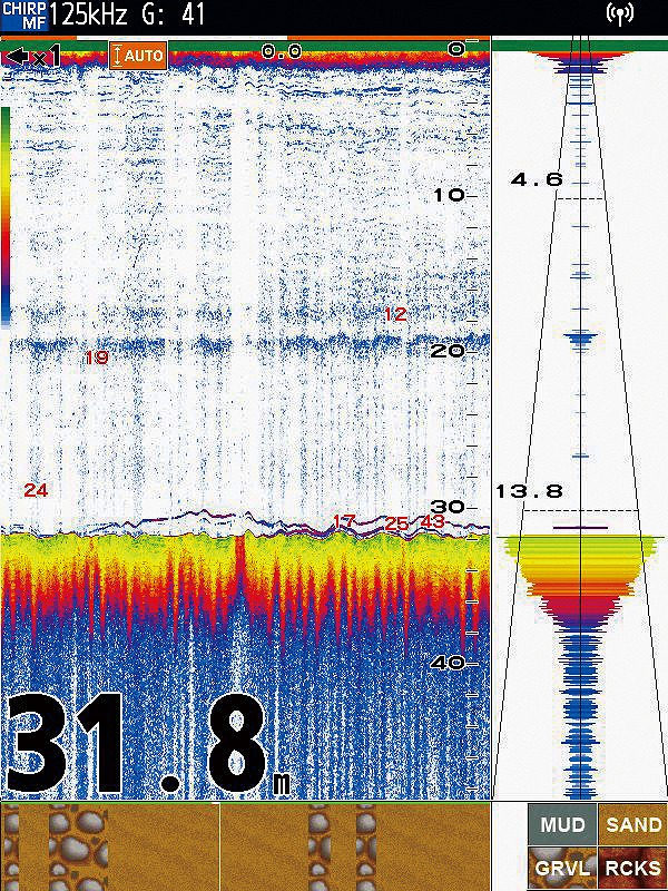 泳がせ釣りをした第三海堡跡付近で撮影したもの。ターゲットとなる大型青ものは映っていない。海底付近には単体魚が映っているが、これは大型青ものではなく別の魚