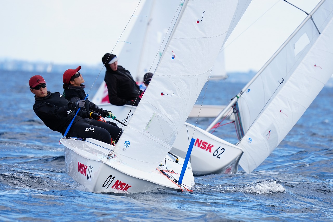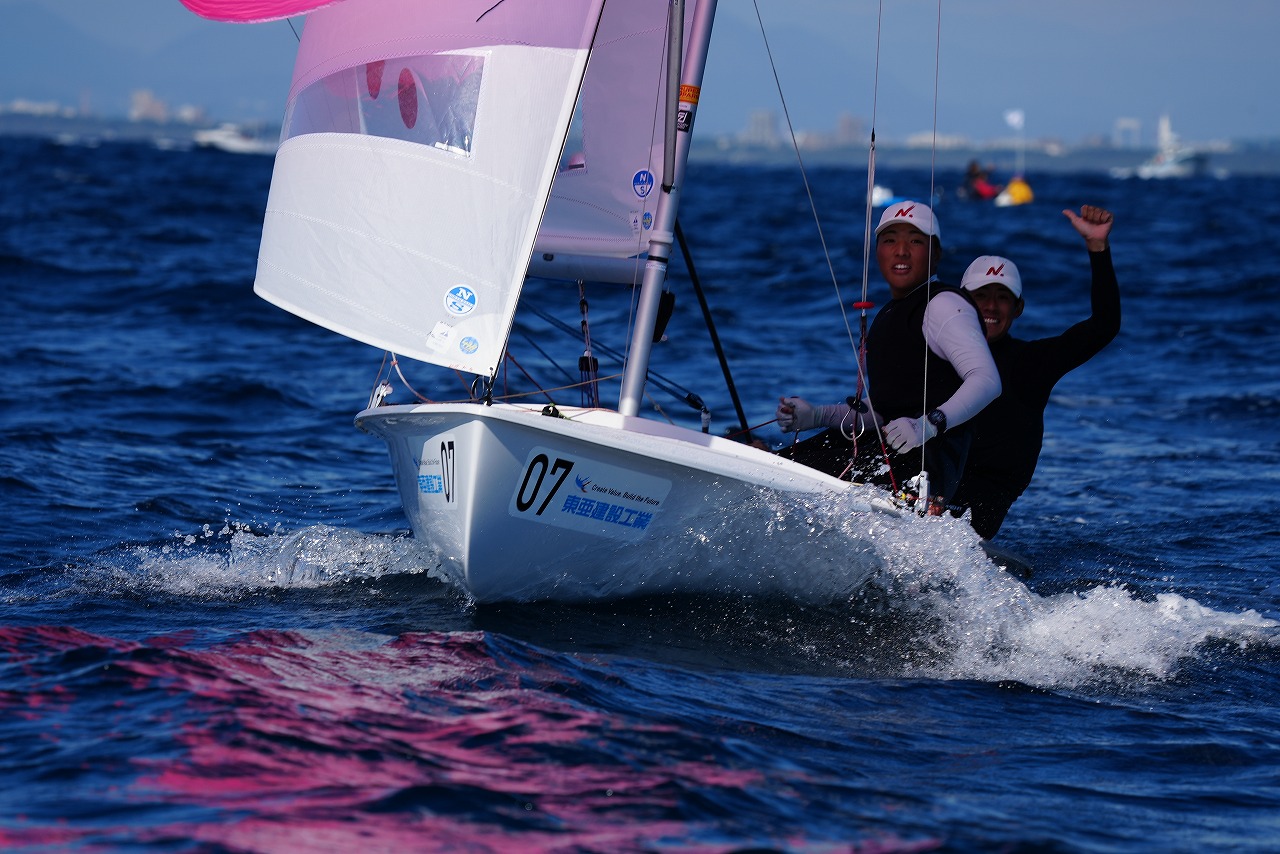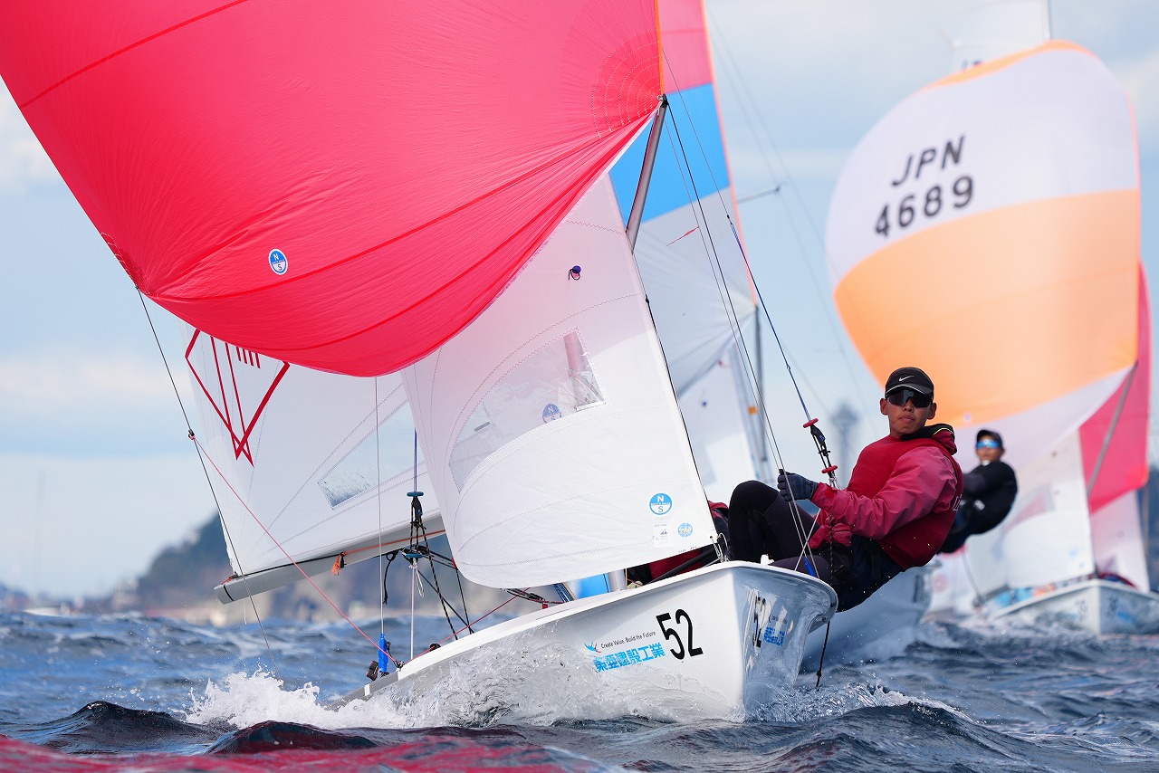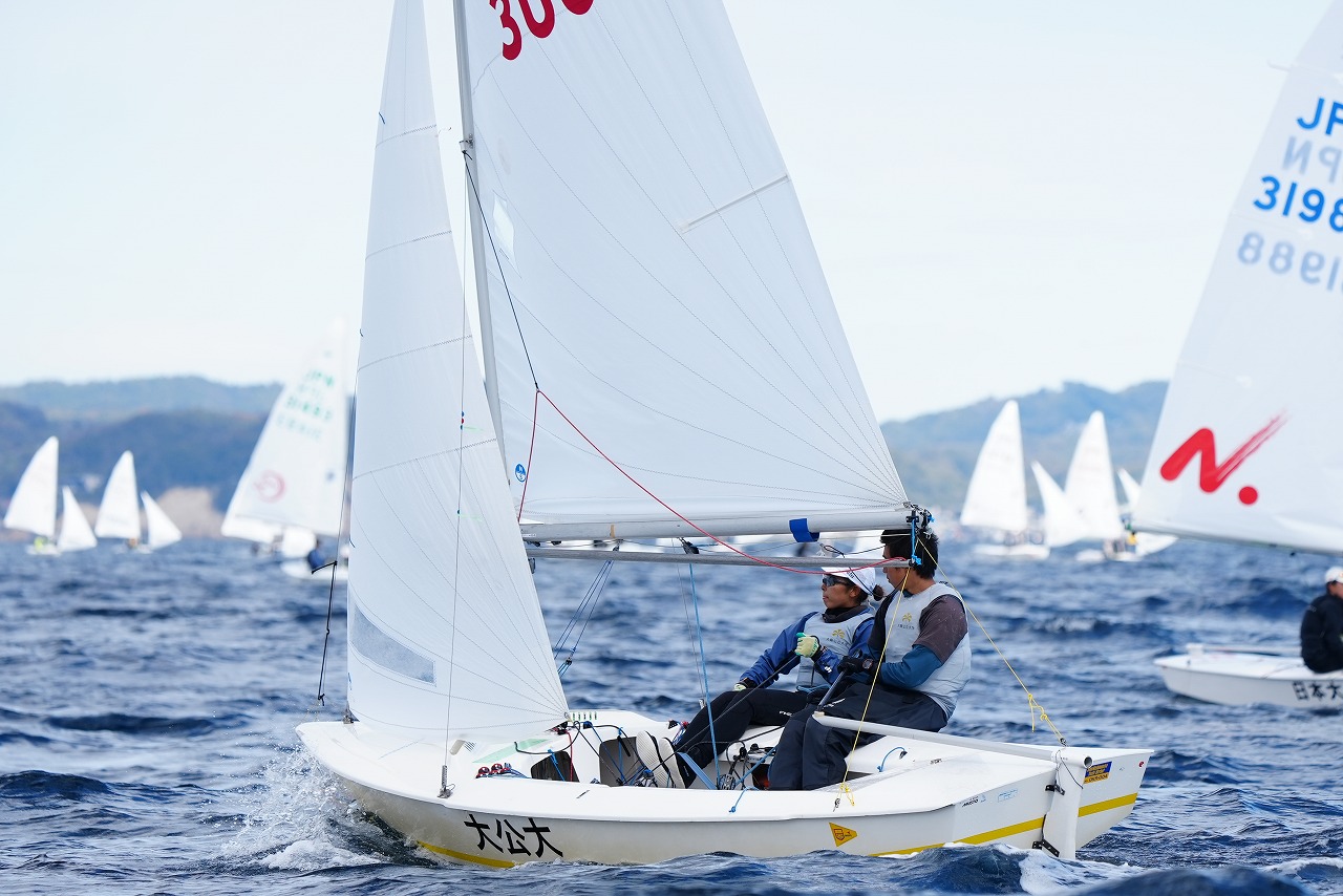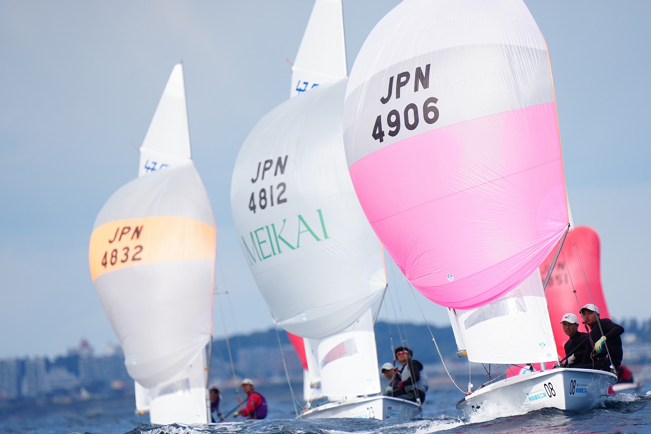 第8レースで先頭で第1マークに向かう杉原 豪 /山本信之介(日本大学)。すぐ後ろを走るのは同大学の池田海人/末吉 源