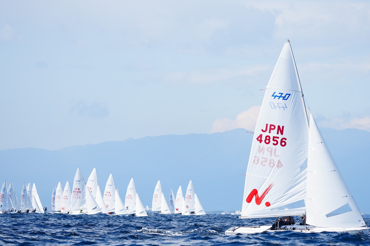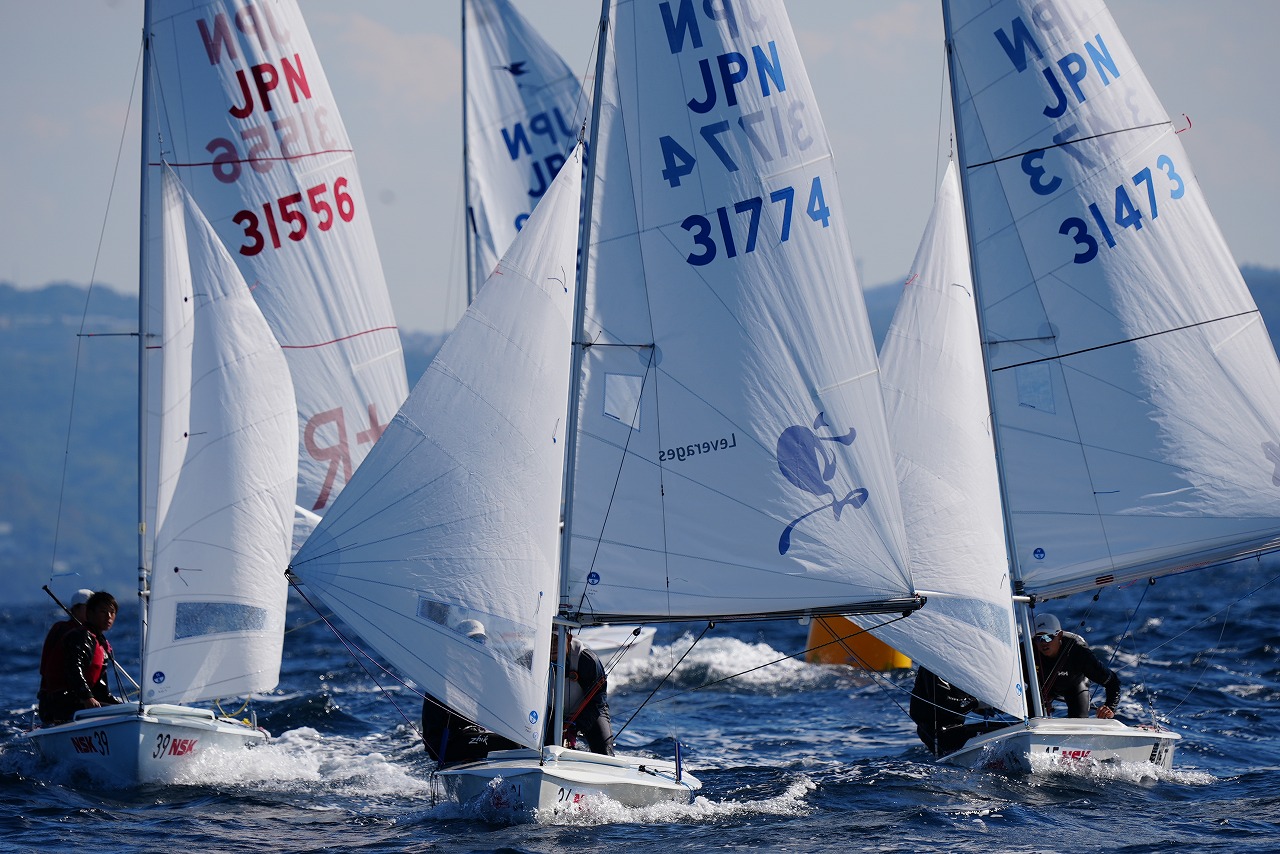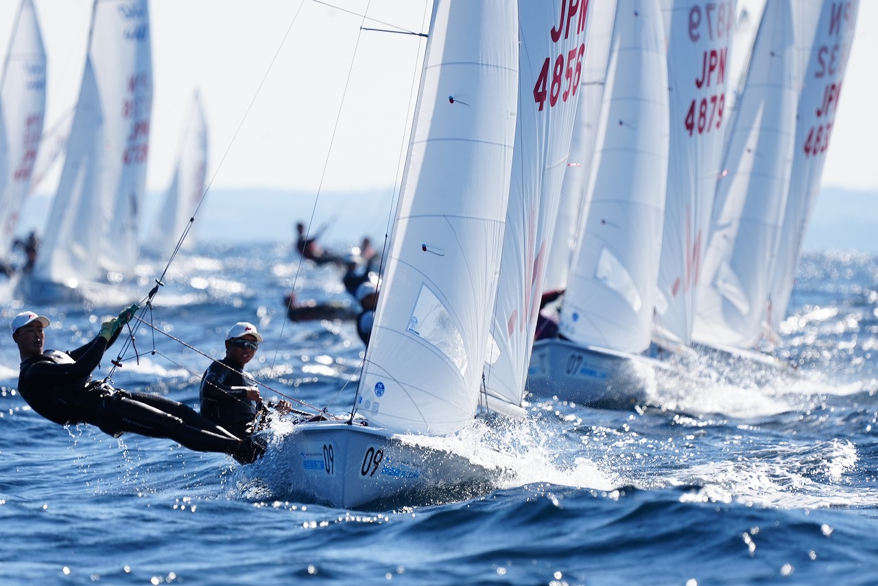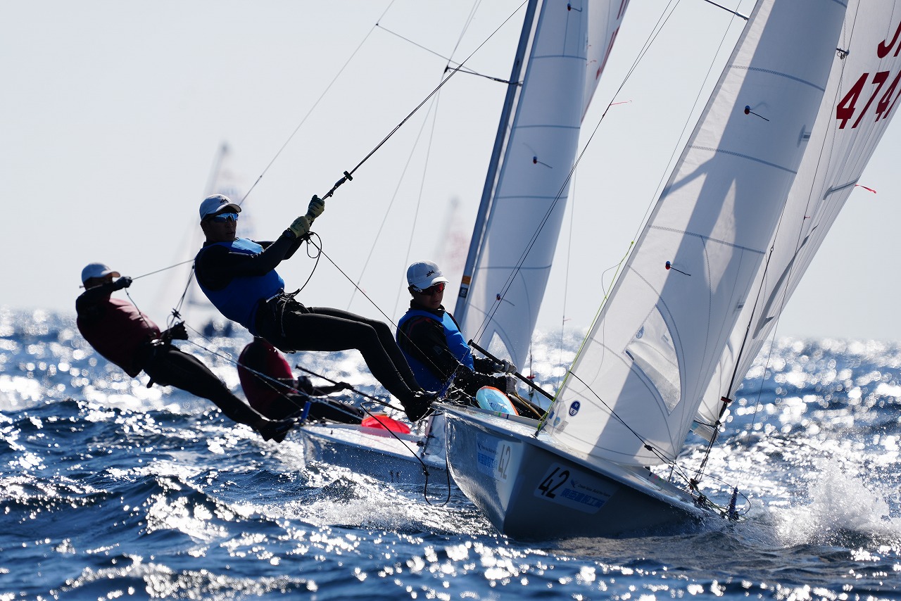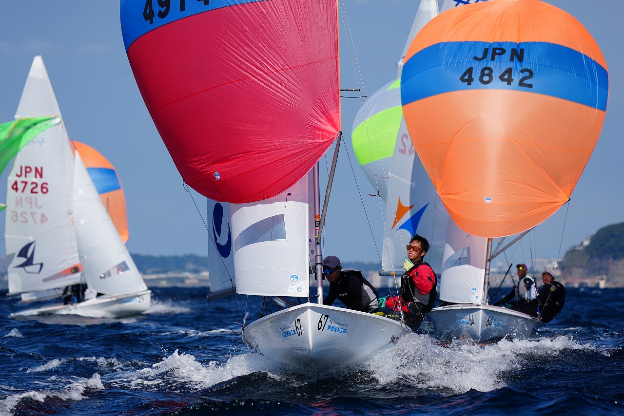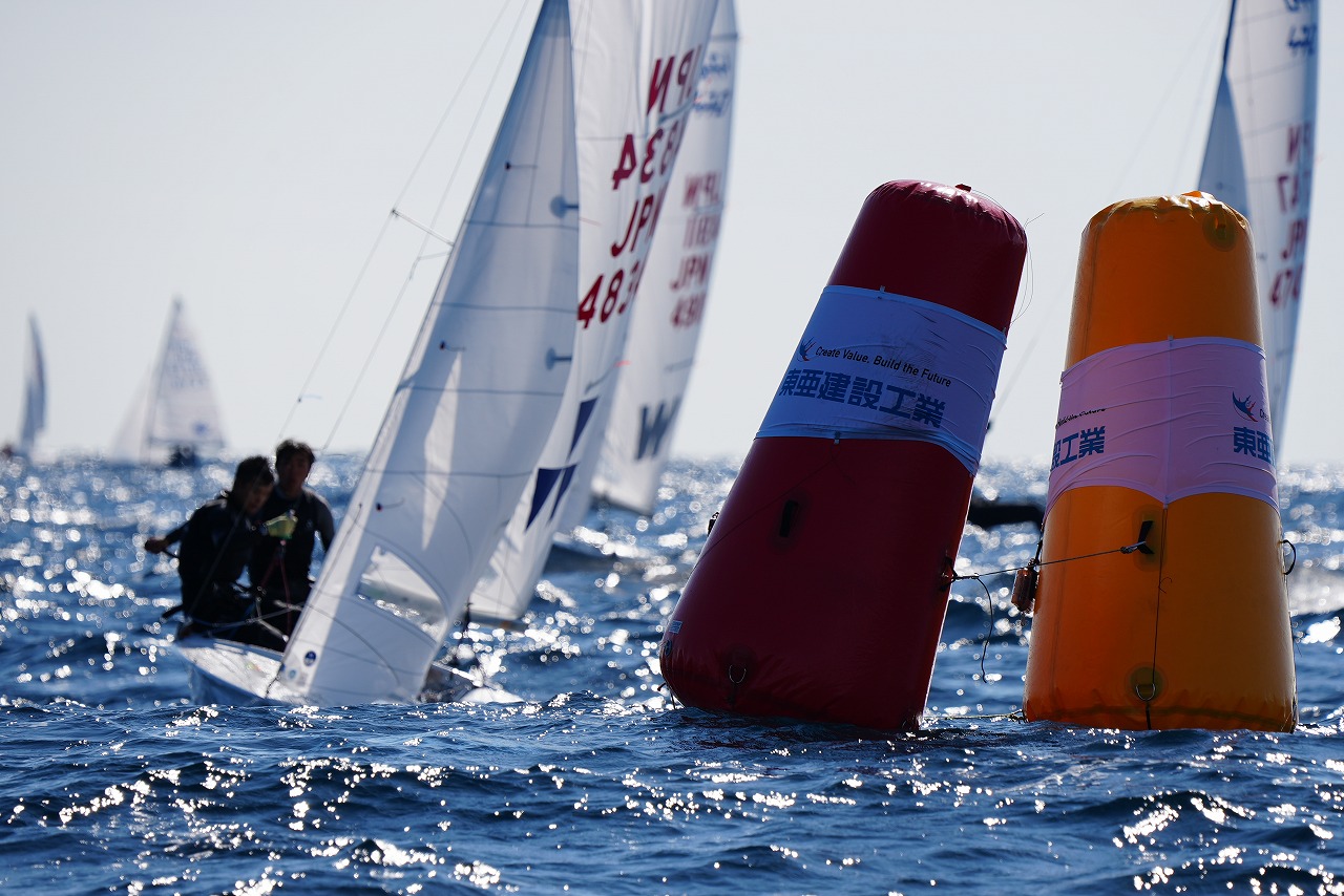 第8レースで先頭で第1マークに向かう杉原 豪 /山本信之介(日本大学)。すぐ後ろを走るのは同大学の池田海人/末吉 源