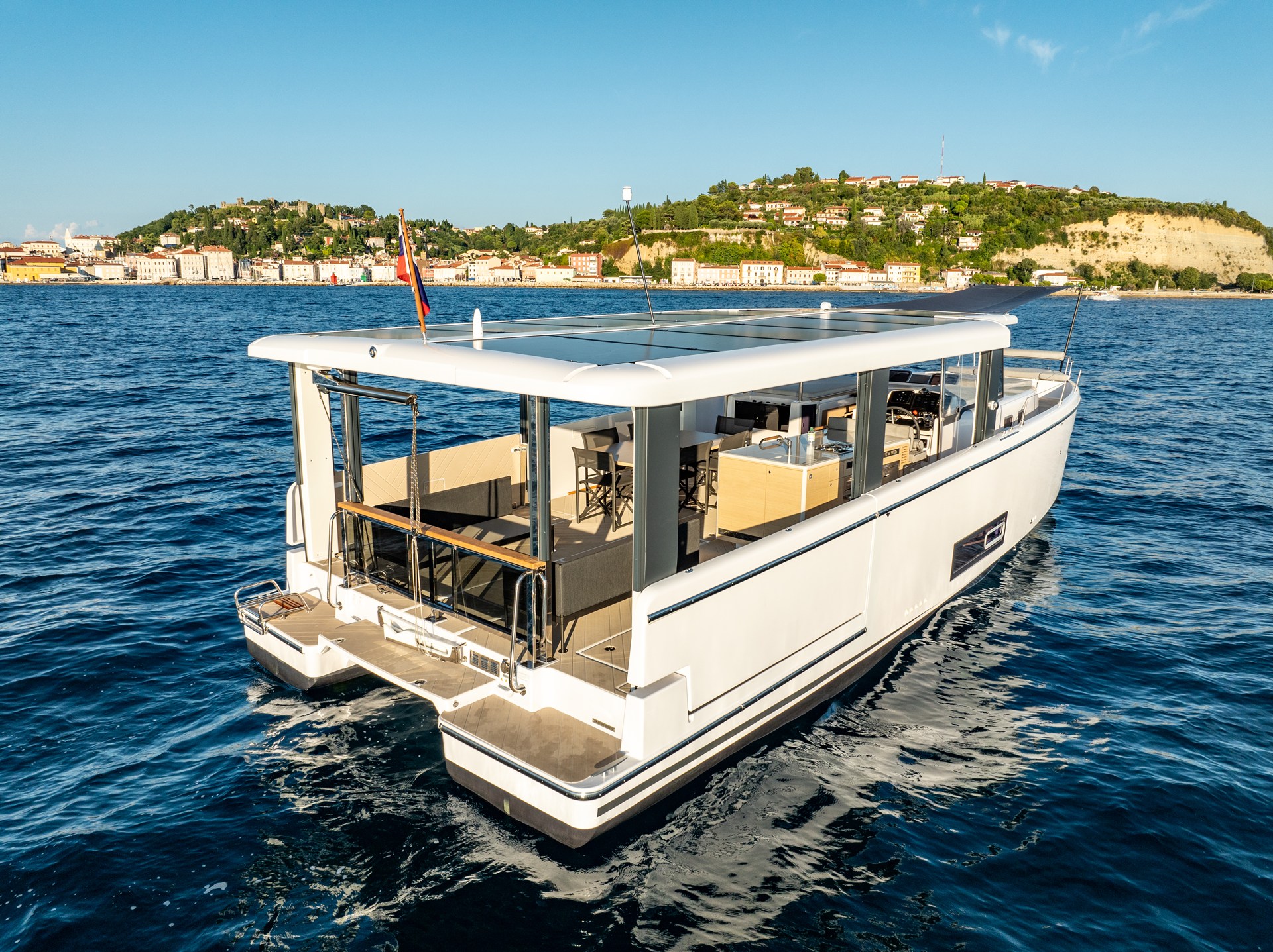 大きな屋根に設けられたソーラーパネル(4.2kW)を見てもわかるとおり、パワーユニットにはオプションのエレクトリックモーターを追加することが可能。30kWhバッテリーを搭載し、エレクトリックモーター単体での連続航行距離は7ノットで15海里、ハイブリッドによる航走時には7ノットで250海里となっている。新時代の動力システムは、騒音に悩まされることなく、環境にも優しいという特性を備え、海の上での静粛なリラックスタイムを過ごすことが可能だ。