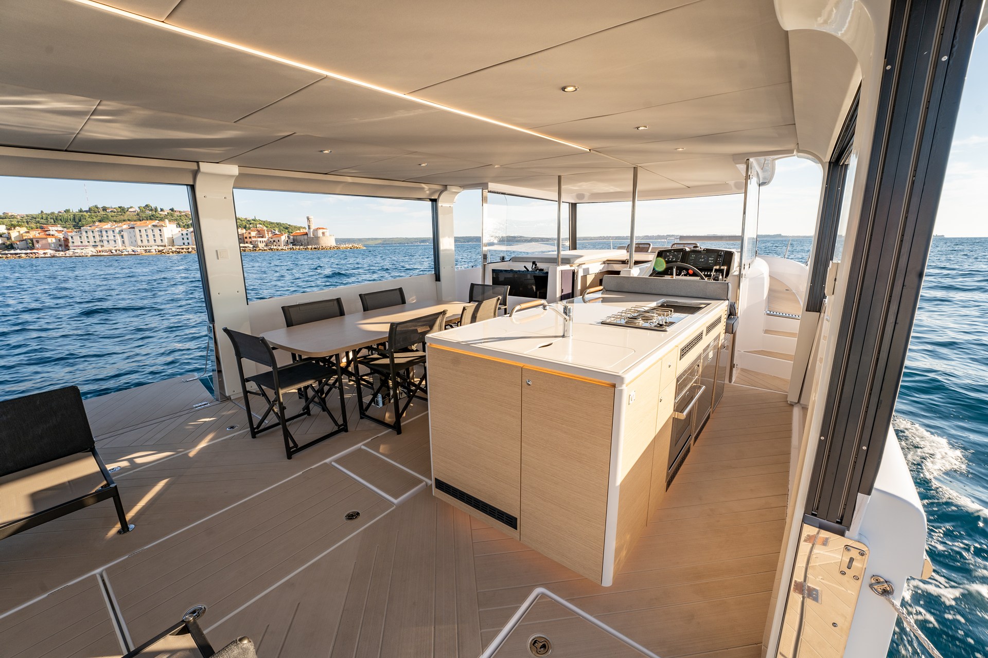 圧倒的な開放感を誇る船上空間。広々としたスペースには、大きなアイランドキッチンとダイニングテーブルが設けられている。