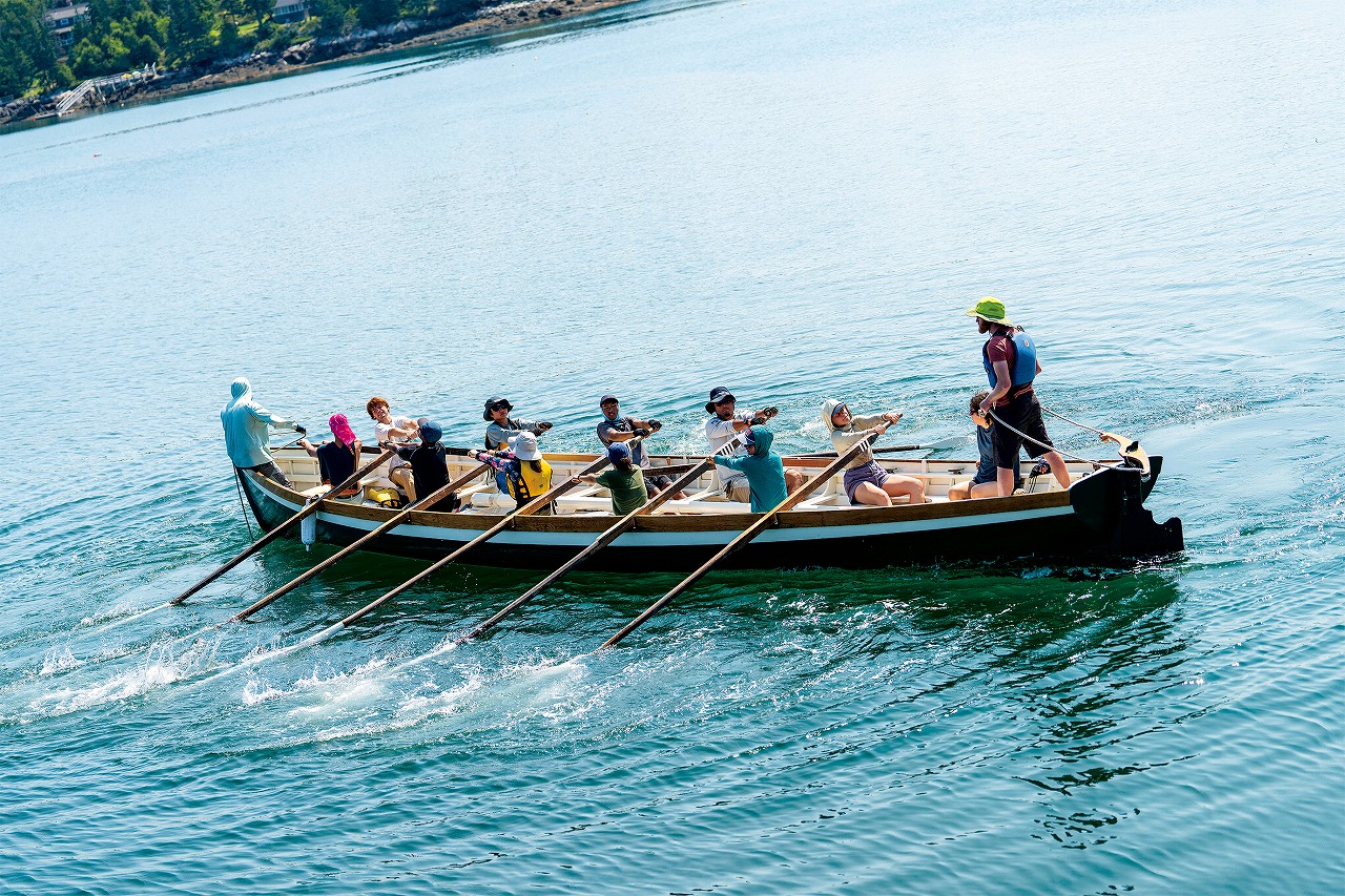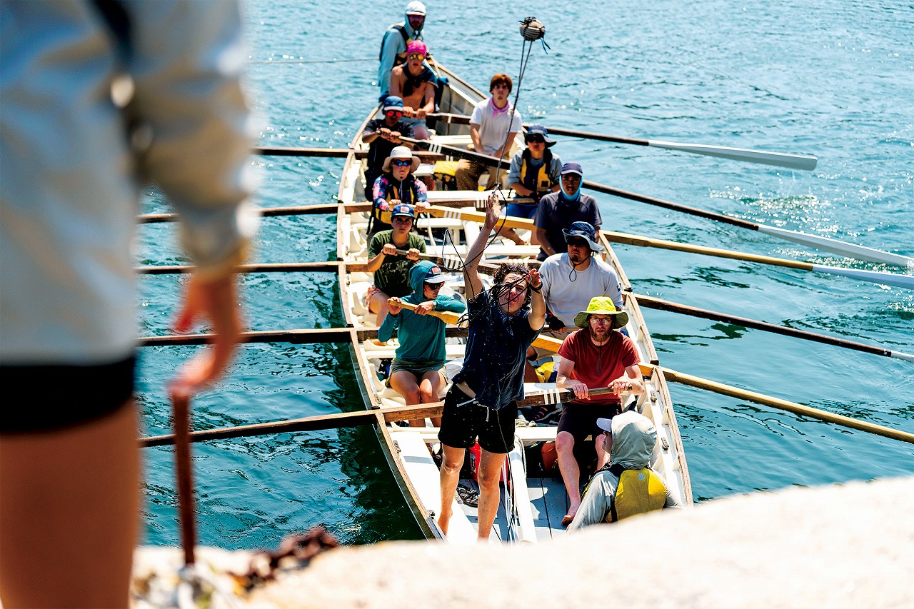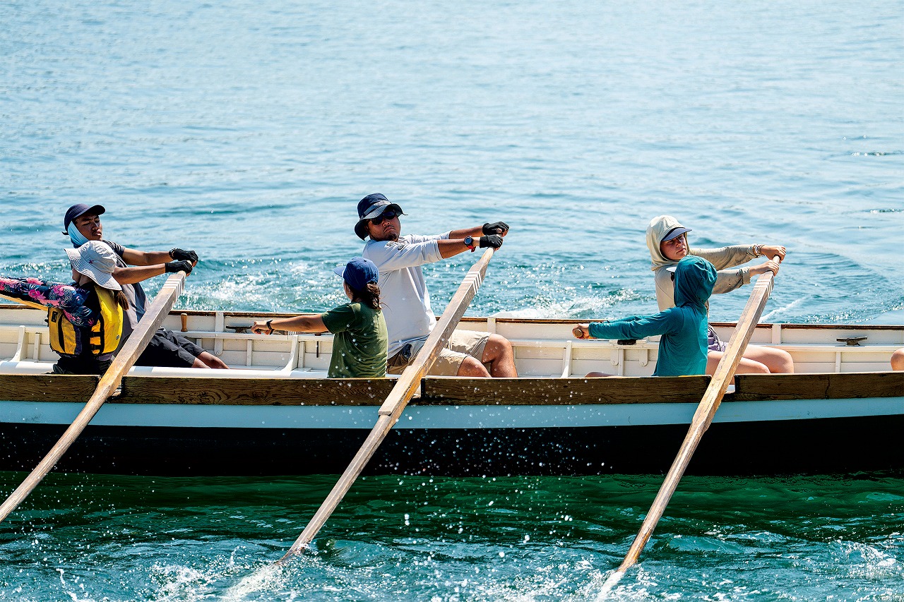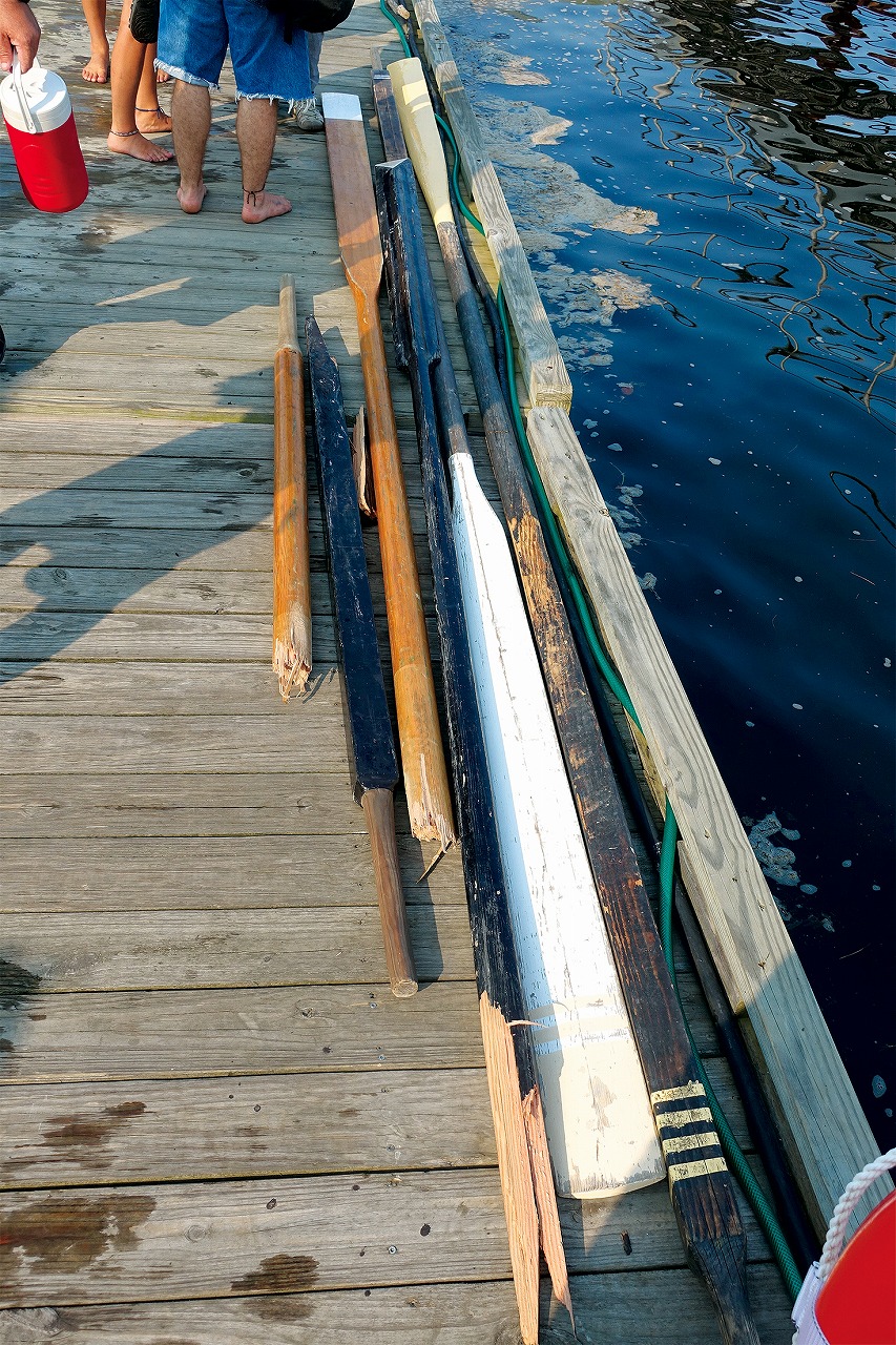 右舷と左舷のクルーが逆に座っている。オールを漕ぐことで、艇がその場回転するのだ