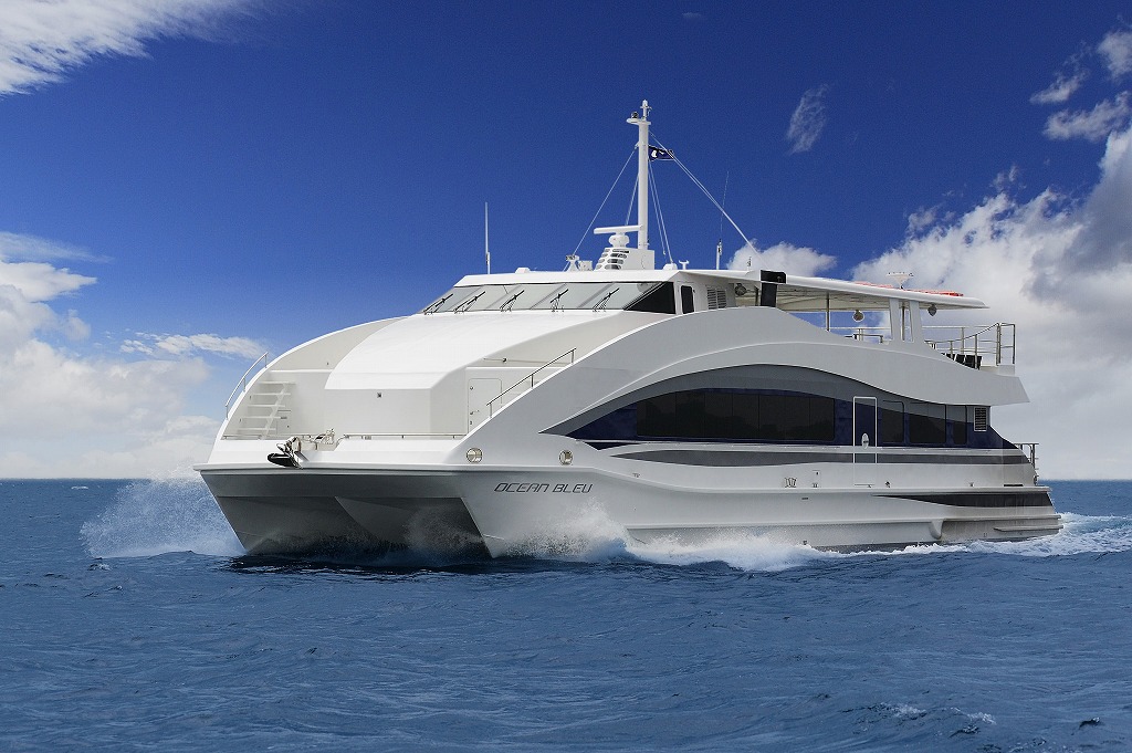 船は〈オセアンブルー〉。広い船室にはテーブルとイスが設置され、ゆったりとリラックスしたクルージングを楽しむことができる
