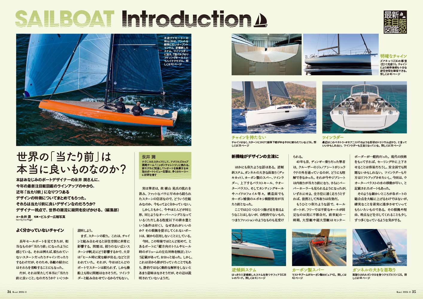 海外艇は発表されたばかりの新艇を中心に、国内艇は根強い人気を誇るモデルも含めて、カタログパートではセールボート35艇、パワーボート9艇を紹介し、読者の皆さまを華麗なるニューモデルの世界へお連れします。