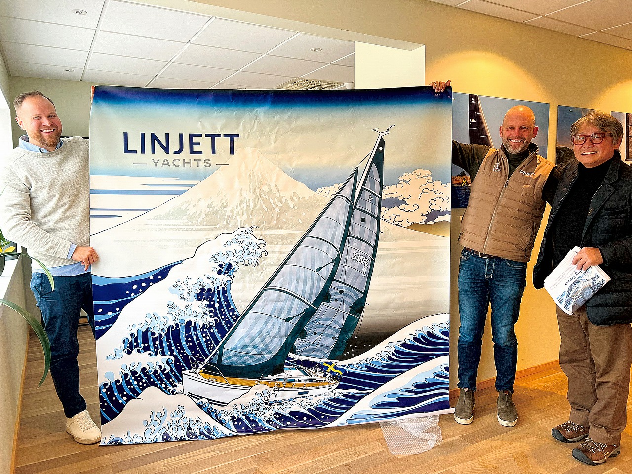 2025ヨコハマフローティングヨットショーに展示され話題となった、浮世絵風のリンジェットポスター。左からマッティ・ウィクホルムさん(営業部長)、ダニエル・グスタフソンさん(社長)、たひらさん