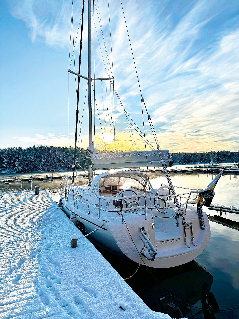 造船所前に係留され、雪を被ったリンジェットの新型モデル。11月のスウェーデンの日常