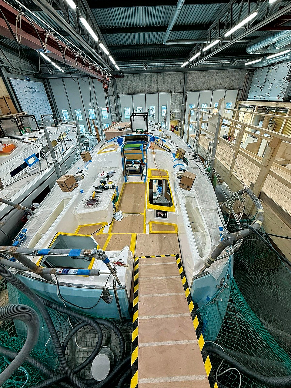 スウェーデン南東部、バルト海に面したリンジェットヨット造船所。整然としたドックで建造が進む