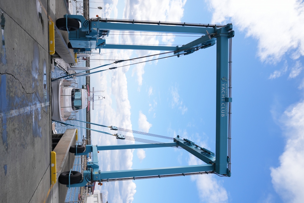上下架施設は自走式クレーンで、荷重は75トンまでと大型だ。ちなみにメンバーの艇が漂流物などに当たったりした被害状況を確認するためであれば上下架は無料