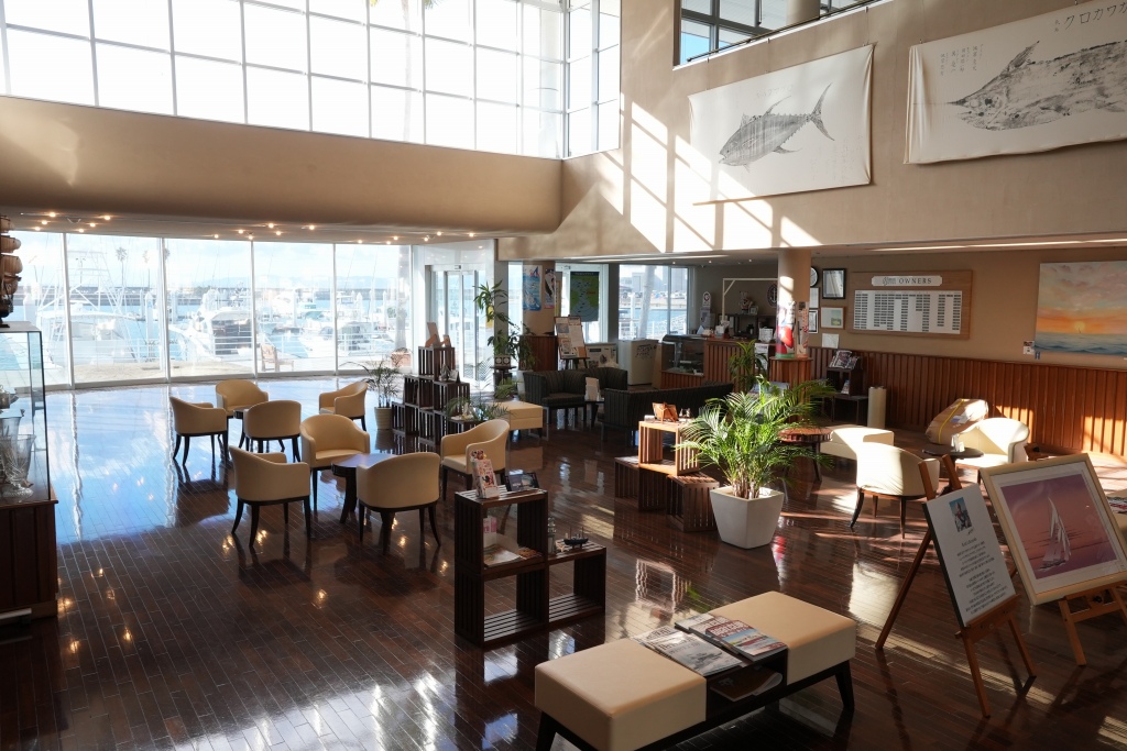 明るく開放的なクラブハウスには、魚拓も飾られている。外洋へのアクセスがいいこともあり、大型青ものなどを釣り上げてくる人もいるのだとか