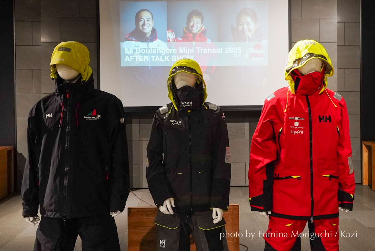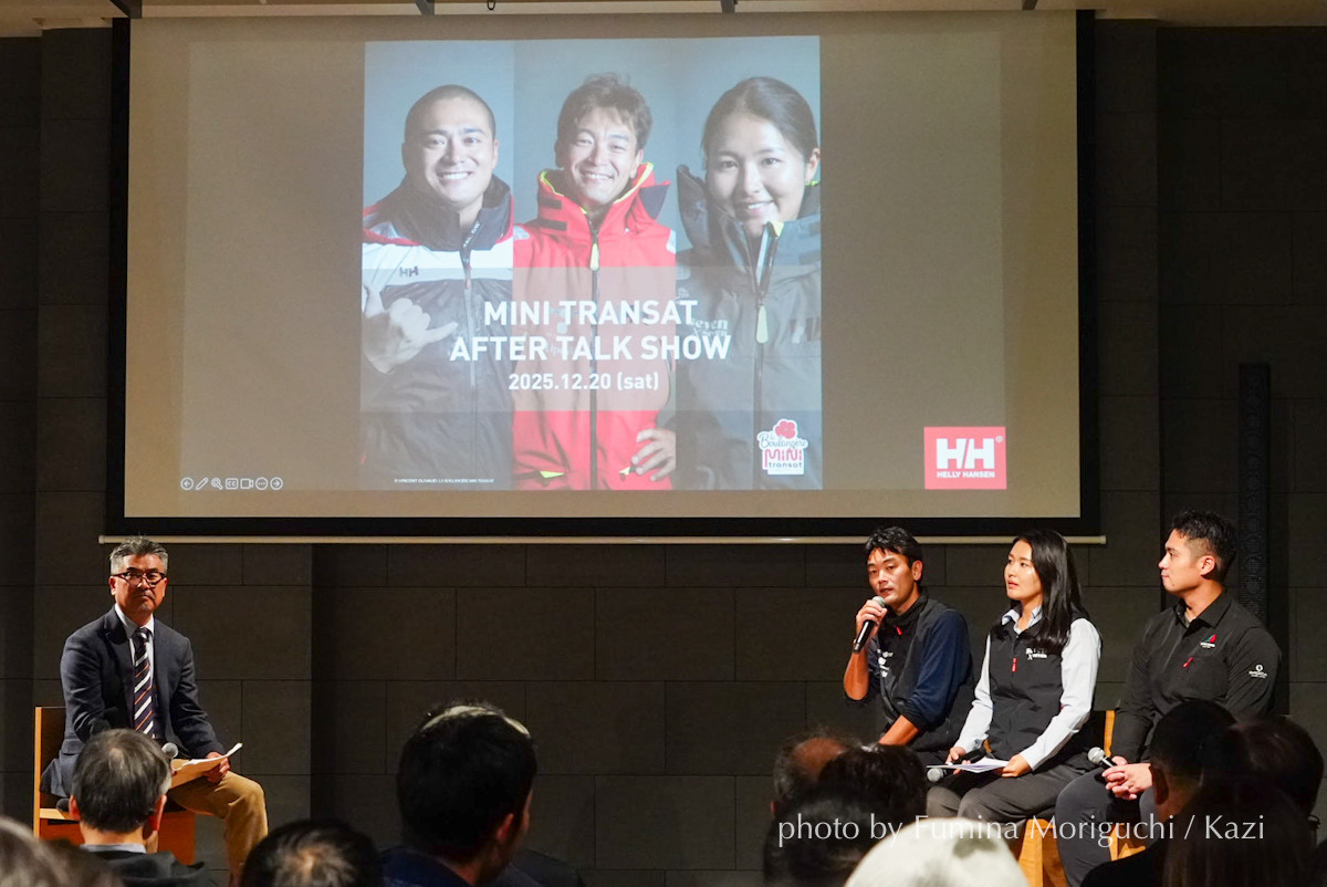単独大西洋横断ヨットレース「ミニトランザット2025」に出場した高原奈穂さん、中山寛樹さん、國米 創(はじめ)さんら日本人3選手によるアフタートークショーが、12月20日にゴールドウイン本社(東京都港区)にて開催された。司会進行として、ミニトランザット2019、2023、2025と3大会を取材した、バルクヘッドマガジン編集長の平井淳一さんが選手と共に登壇。約60分のトークと質疑応答、記念撮影が行われた。