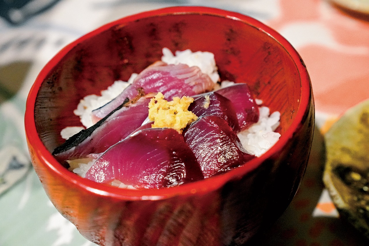 船上で精米し、かまどで炊いたホカホカご飯にスマガツオを乗せて♪
