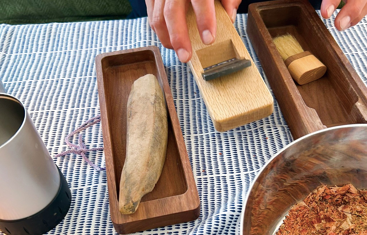 相澤規勝オーナーの出港前準備のひとつが鰹節削り。化学調味料は極力使わない主義