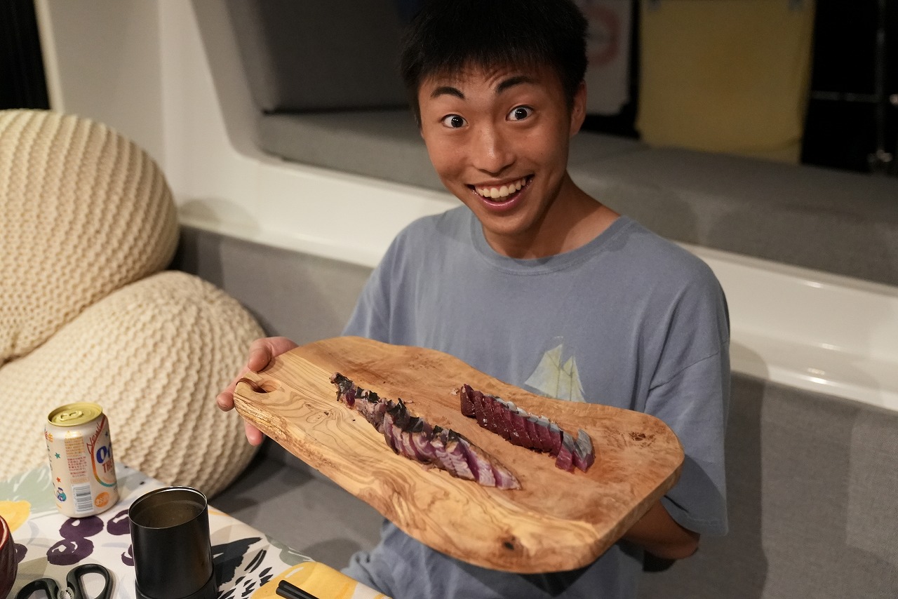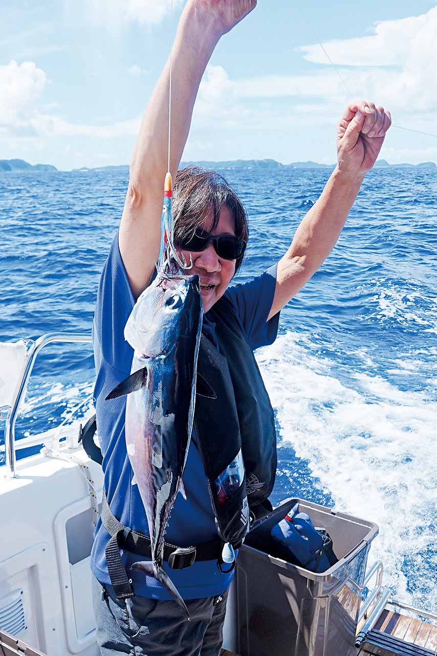 慶良間諸島を発ち、疑似餌を流すとすぐにスマガツオが釣れた! 航海中にゲットしたスマガツオは8 匹!