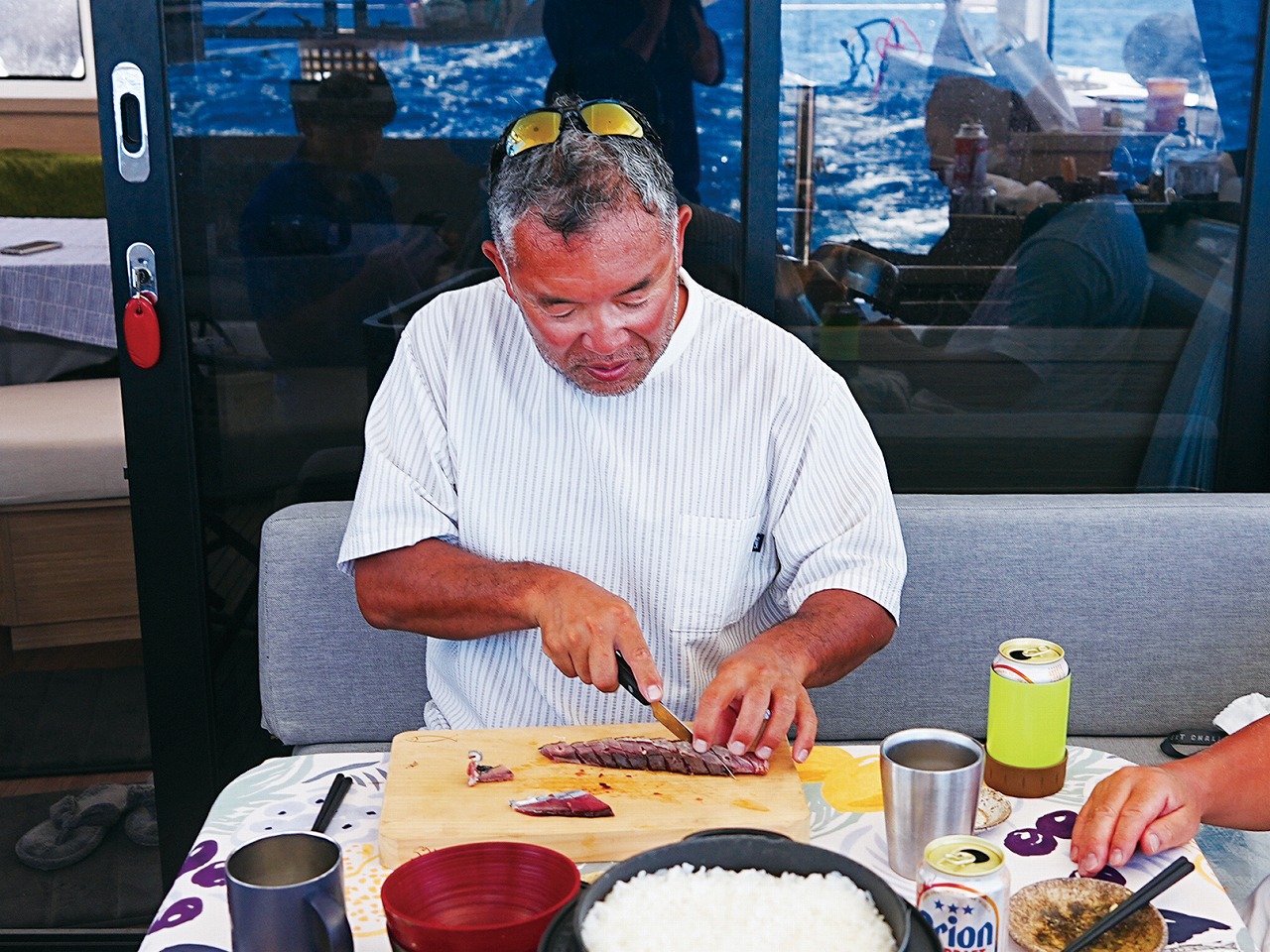 賑やかな食卓。夜も更け、クルージングはナイトセーリングに入っていく