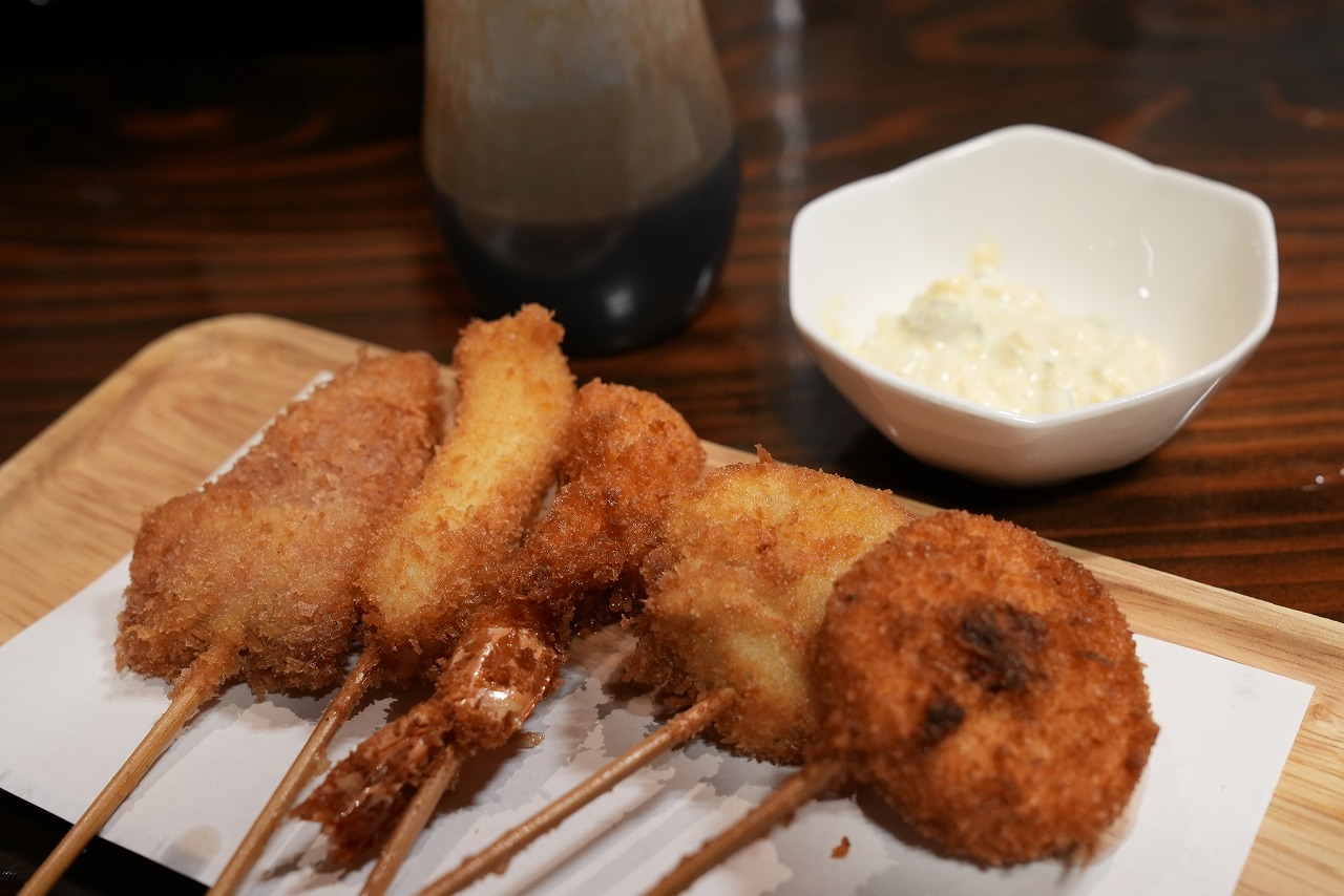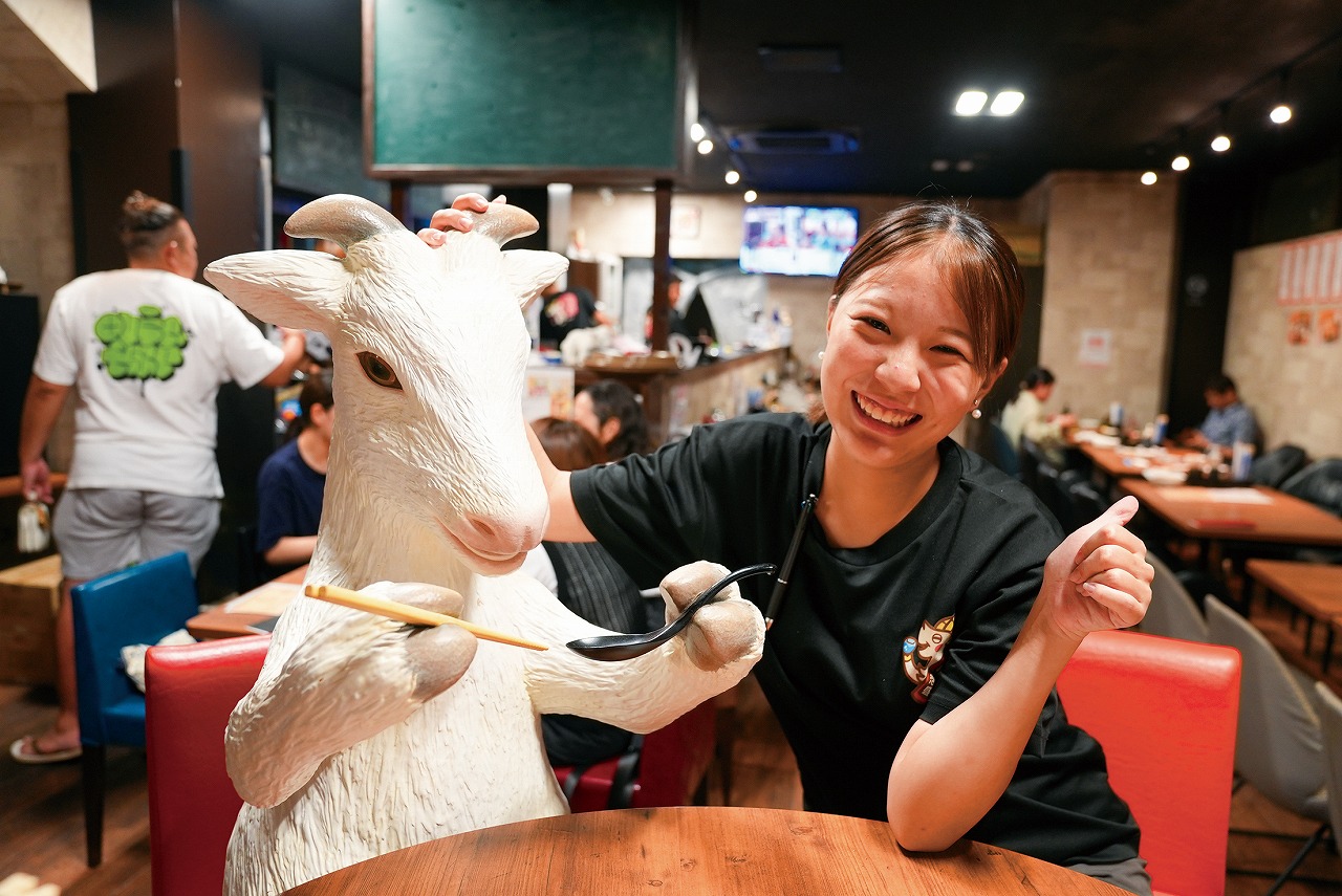 ヤギの人形が席に座る不思議な居酒屋。ヤギ料理はもちろんうまいが、串揚げが絶品。つまみはだいたい1品385円とリーズナブルなのもうれしい。