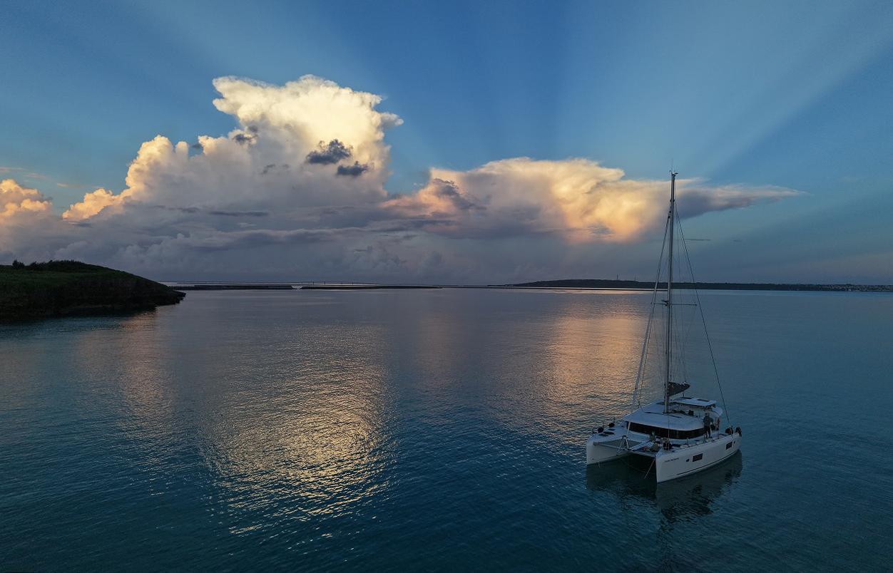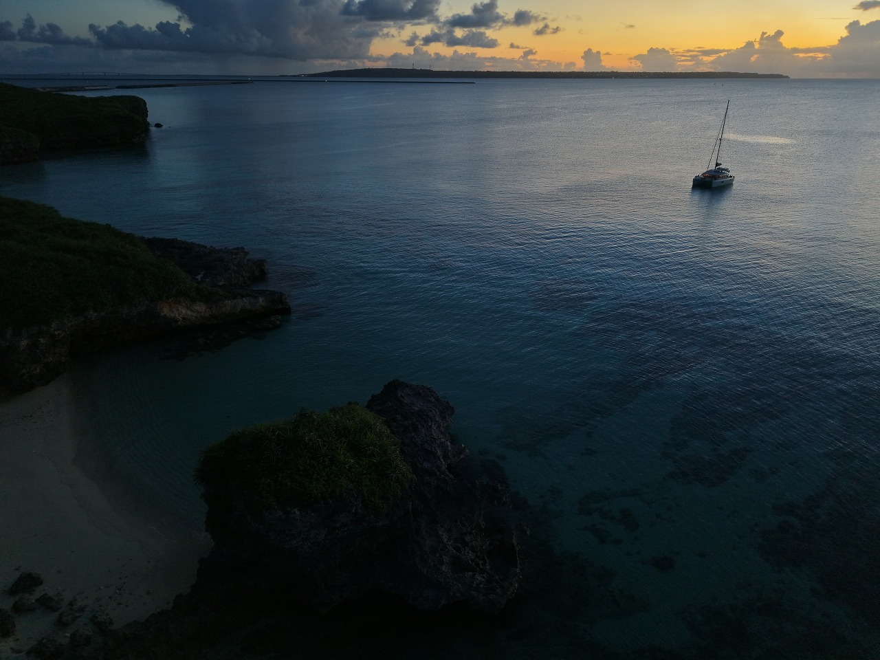 photo by Shigehiko Yamagishi | 宮古島、安全で人気のアンカリングスポット、砂山ビーチに錨泊した〈アケーディア・ロシナンテ〉(ラグーン42)。一夜を明かし、いつしか東の空が明るくなってきた・・・。さあ、宮古島を巡る冒険を始めよう