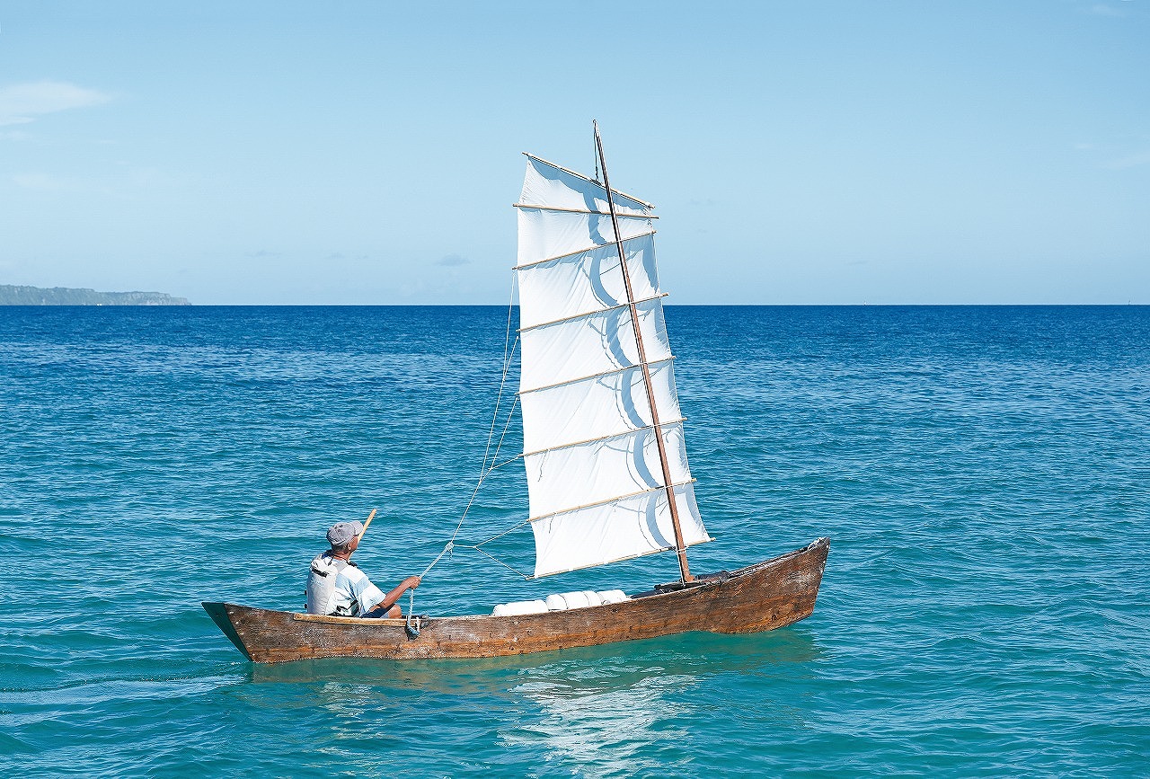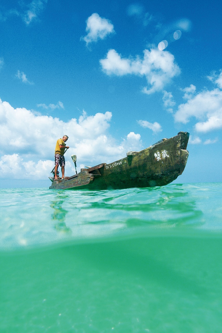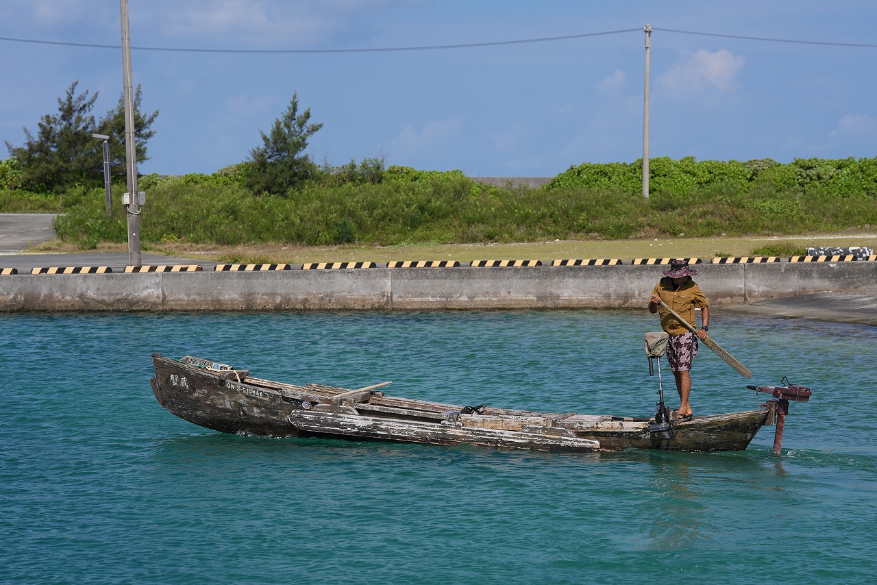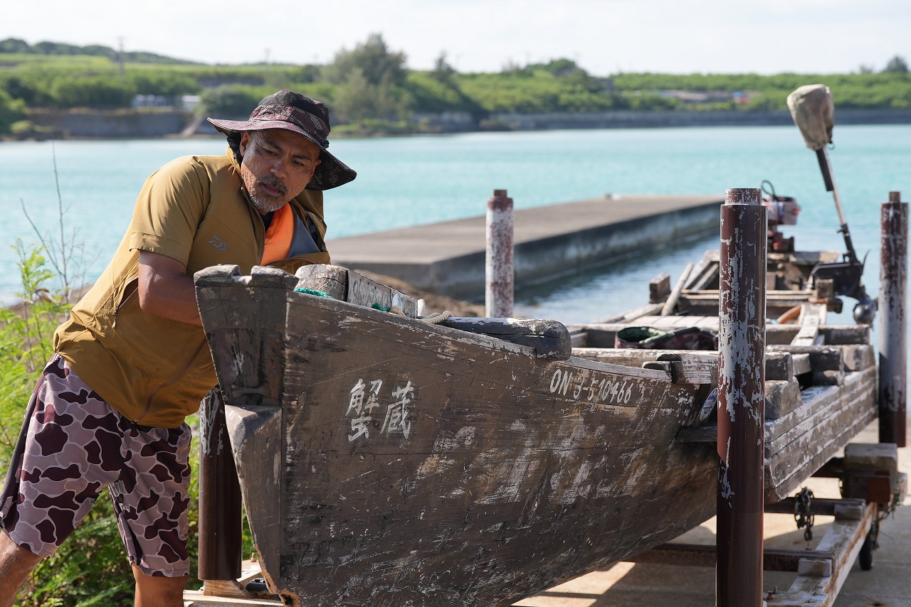 宮古ブルーの世界を進む、蟹蔵さんのサバニ