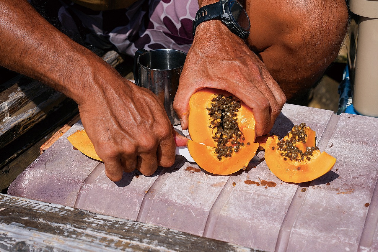 クルーズ中にもてなされたパパイヤ。タネは辛みがあってうまい(個人の感想です)